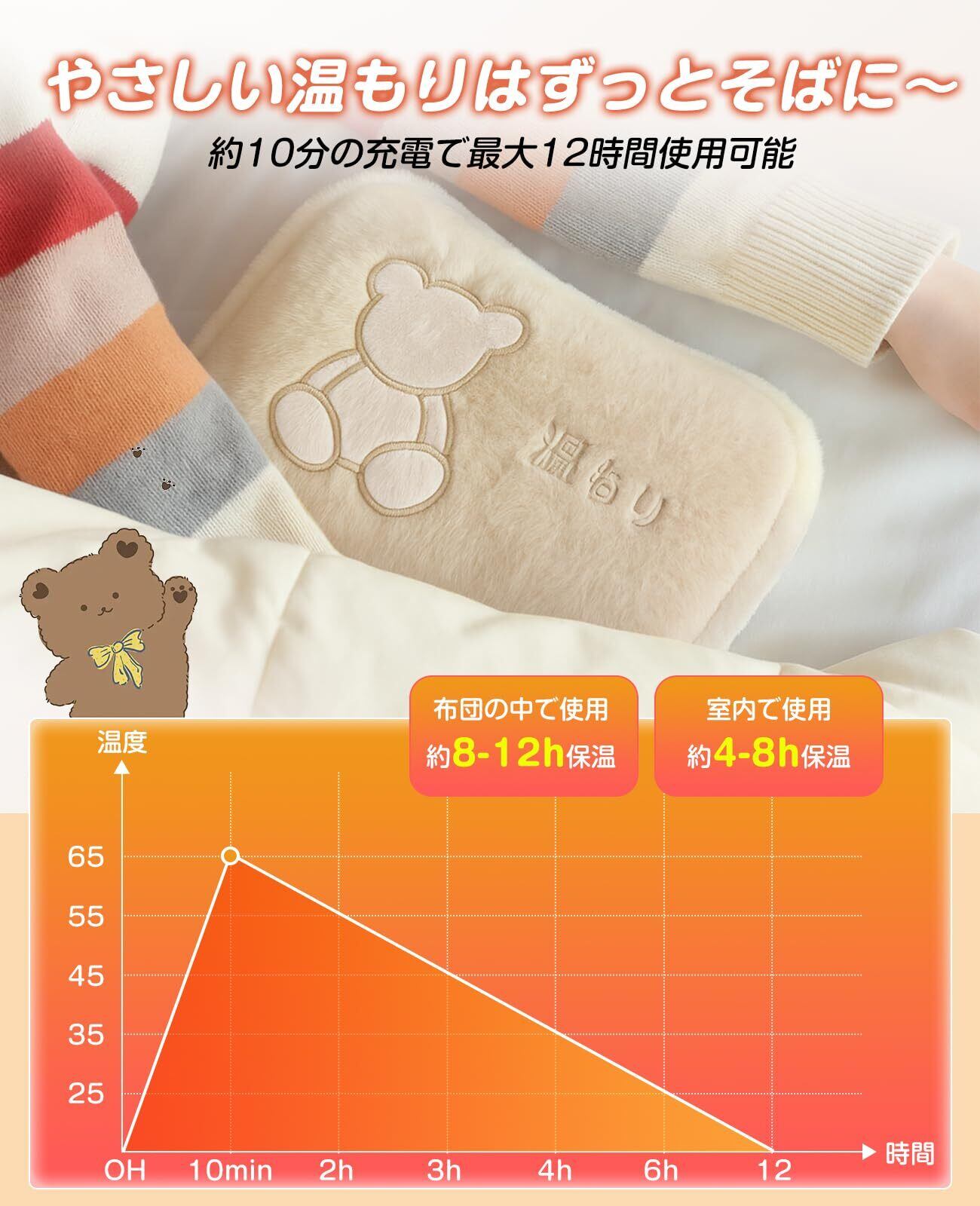 【急速充電で長時間保温!】わずか約8〜12分の充電でしっかり蓄熱。室内では約4〜8時間、布団の中では約8〜12時間あたたかさをキープします。手・足・腰・肩・ひざなど、冷えやすい部分をやさしくあたため、寒い冬の夜も朝まで心地よいぬくもりに包まれます。電気代もわずかで経済的。忙しい日常にもぴったりの頼れる冬のパートナーです。