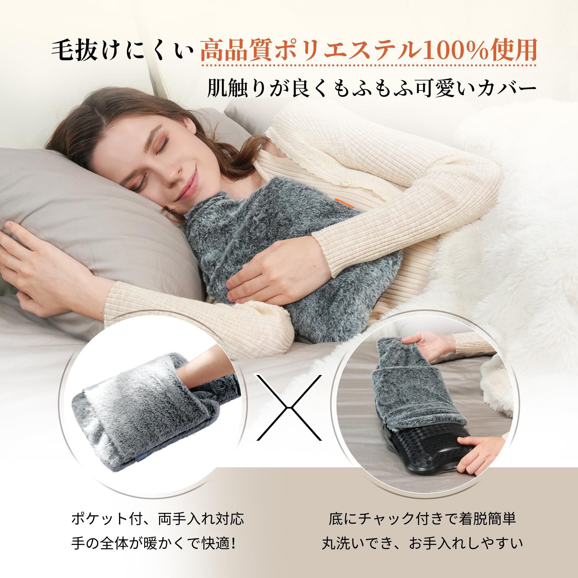 【もふもふなカバー付】カバーは肌に直接触れても安心な高品質ポリエステル素材で作られています。ふわふわもこもこな心地よい肌触りで、触れた瞬間温め感じられます。片面にポケット付きデザインがあり、両側から手を入れて手の全体を温めることができます。カバーの底には便利なチャック設計により簡単に着脱可能。ネットに入れて洗濯機で丸洗い対応なので、お手入れがしやすくていつも清潔使用ができます。
