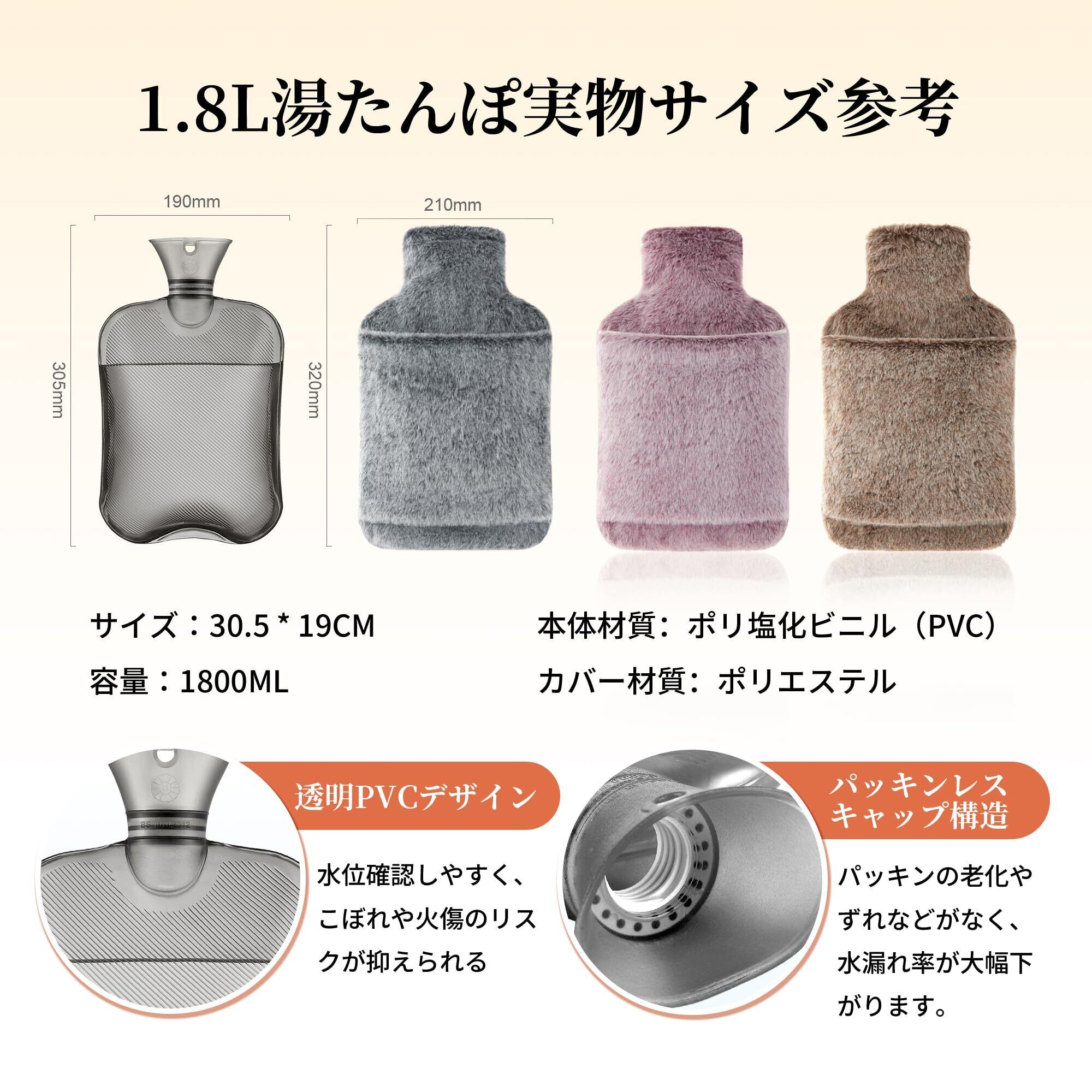 【大容量・耐久性抜群】本体サイズ:30.5*19cm;本体容量:約1800ml。大容量設計で頻繁にお湯の入れ替えや再加熱の必要がなく、一回の注水で長時間使用可能。大口径じょうこ状注ぎ口はお湯が入れやすく、火傷防止重視のデザインをしています。キャップはパッキンレスだから、パッキンの老化やずれなどがなく、水漏れ率が大幅下がります。