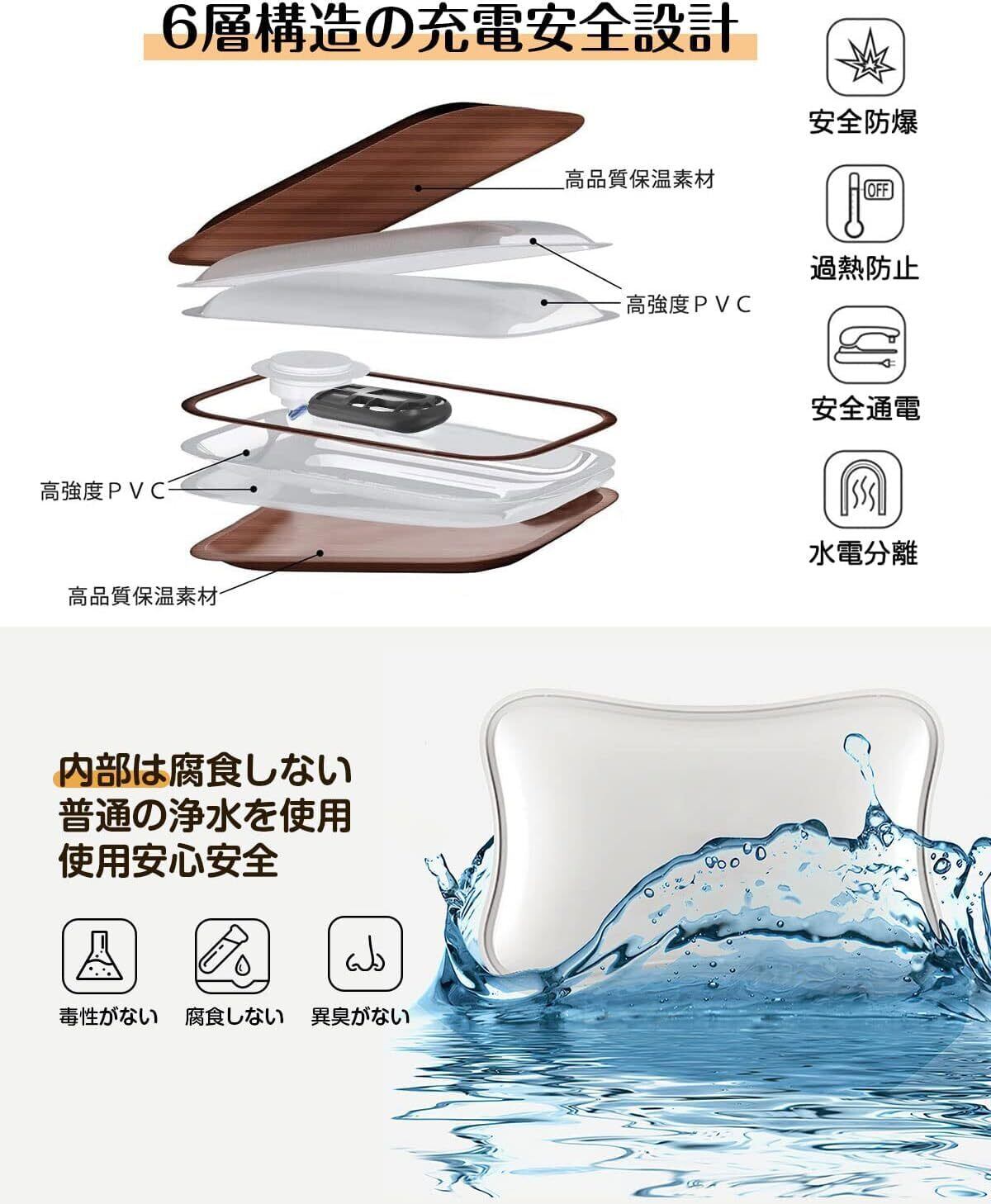【6層防爆設計&自動断電&空焚き防止】6層防爆設計、水と電気の分離デザイン、腐食しない水を採用し、温度過熱防止装置は二重保護チップでできており、ゆたんぽの温度が75℃を超えると自動的に電源が切れる安全設計です。面倒なお湯の入れ替えは一切不要で、繰り返し使えます。