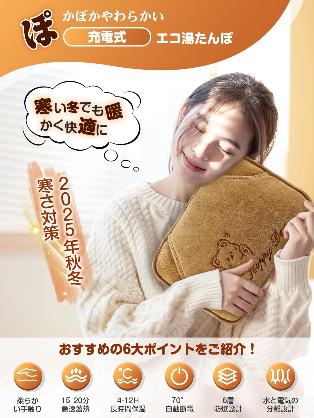 ️【省エネ&エコ湯たんぽ&冬ギフトに最適 】エコでじんわりと温まり、地球にも女性にも優しい充電式ゆたんぽです。電気代は一回の使用で約2円程と経済的です。一ヶ月毎日使用したとしても100円にも満たないので水道を使用する通常のゆたんぽと比較しても経済的に使用する事が出来ます。冷え性の方のみでなく、冷たい布団ではなかなか眠れない方や、キャンプなどのアウトドアにもおすすめの防寒対策グッズです。火を使わず、お部屋の空気を乾燥などの心配もないので安心してお使いいただけます。寒さが深まるこの時季、友人や大切な人へ、あたたかさという最高の贈り物を!