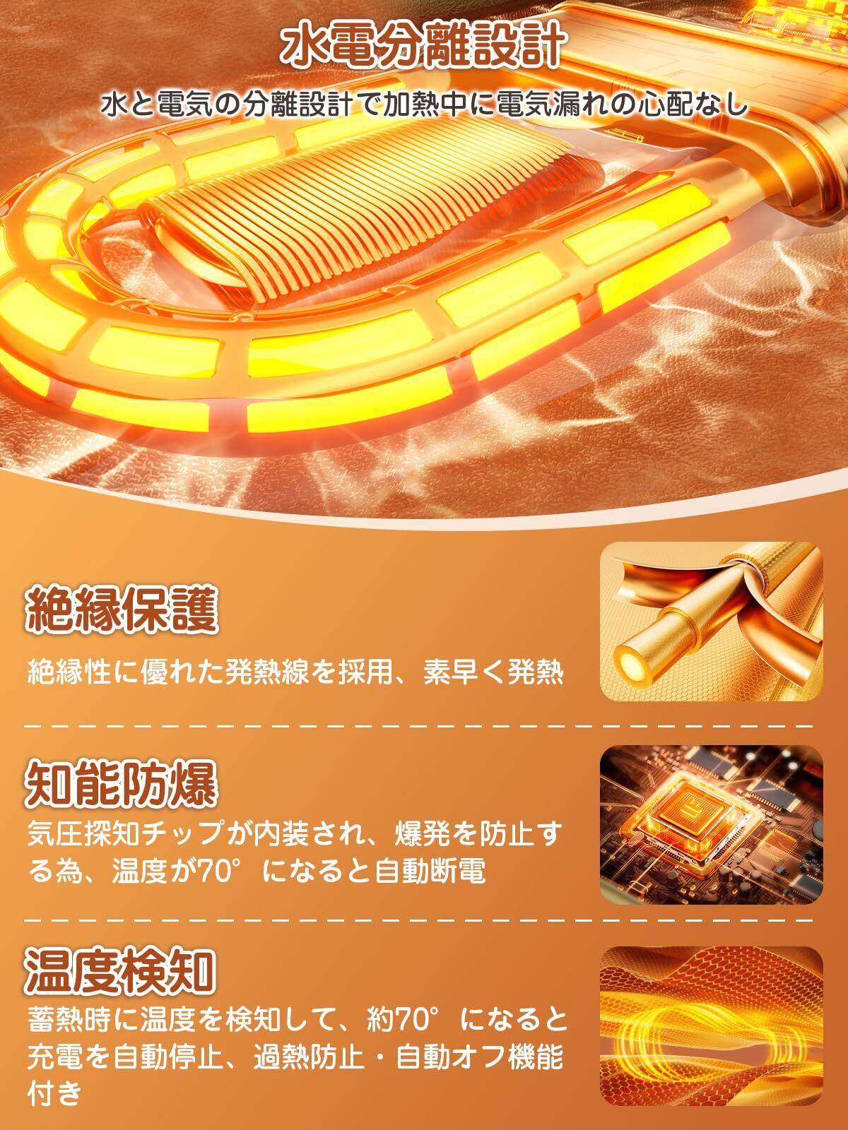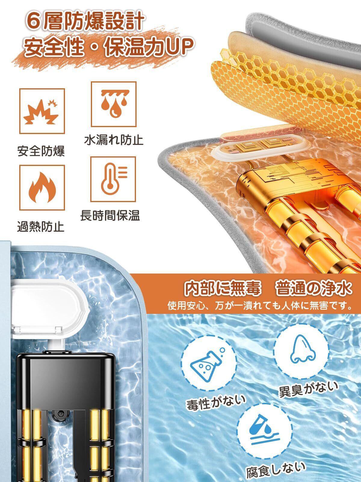 【高品質安全素材&多重保護システム&70°自動断電】電気湯たんぽは高品質保温素材と6層の高強度防爆PVC設計を採用し、水漏れの心配がなく、耐久性が優れて長持ちできます。湯たんぽの内部に水と電気が分離する仕様で、加熱中に電気漏れの心配もありません。安全性に配慮した上に、湯たんぽは過充電防止、過熱保護、短絡保護、過電圧保護、過放電保護、過電流保護などマチルな保護機能も搭載しており、安心・安全にご利用いただけます。防爆充電器は温度センサーを内蔵しており、蓄熱時に70°℃以上を感知すると自動的に通電を停止します。冬にかけて寒くなる時期には手放せなくなる防寒対策用アイテムで重宝して活用する事が出来ます。
