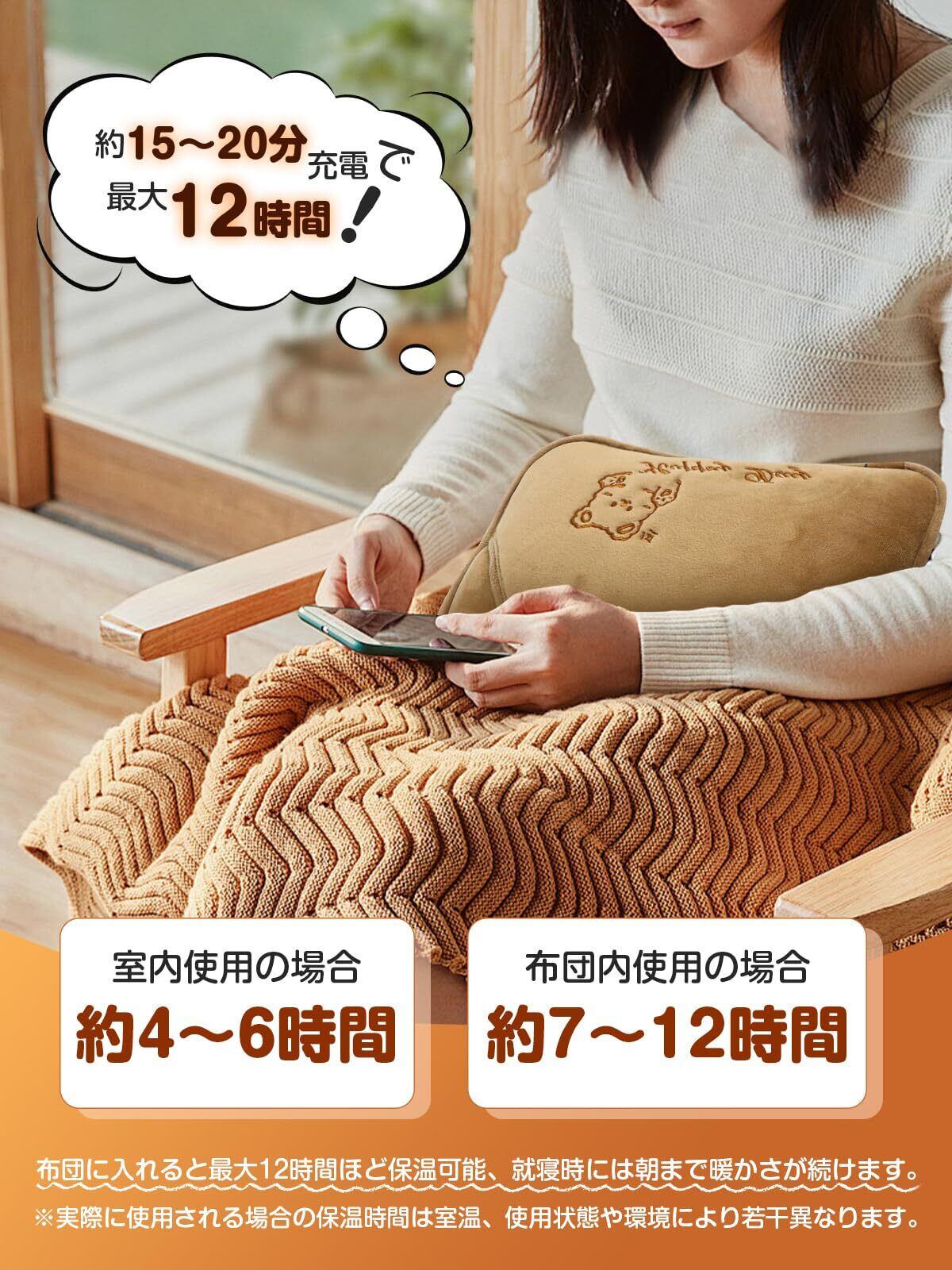 【大きい湯たんぽ&急速充電&長時間保温】市販の湯たんぽよりサイズが大きくて、接触する面積が広いため、熱が伝わりやすく効率的に加温されます。お腹に抱えたり膝に乗せて使いたい場合は、これが最適です。急速充電でわずか15-20分の充電で4〜12時間も温かい状態が続きます!室温で約4~7時間、布団の中なら約7~12時間、じんわり心地よいあたたかさを長時間キープできますよ。(具体的な保温時間は使用環境によって変わることがあります)。就寝時に布団に入れておけば朝まで快適に眠れます~