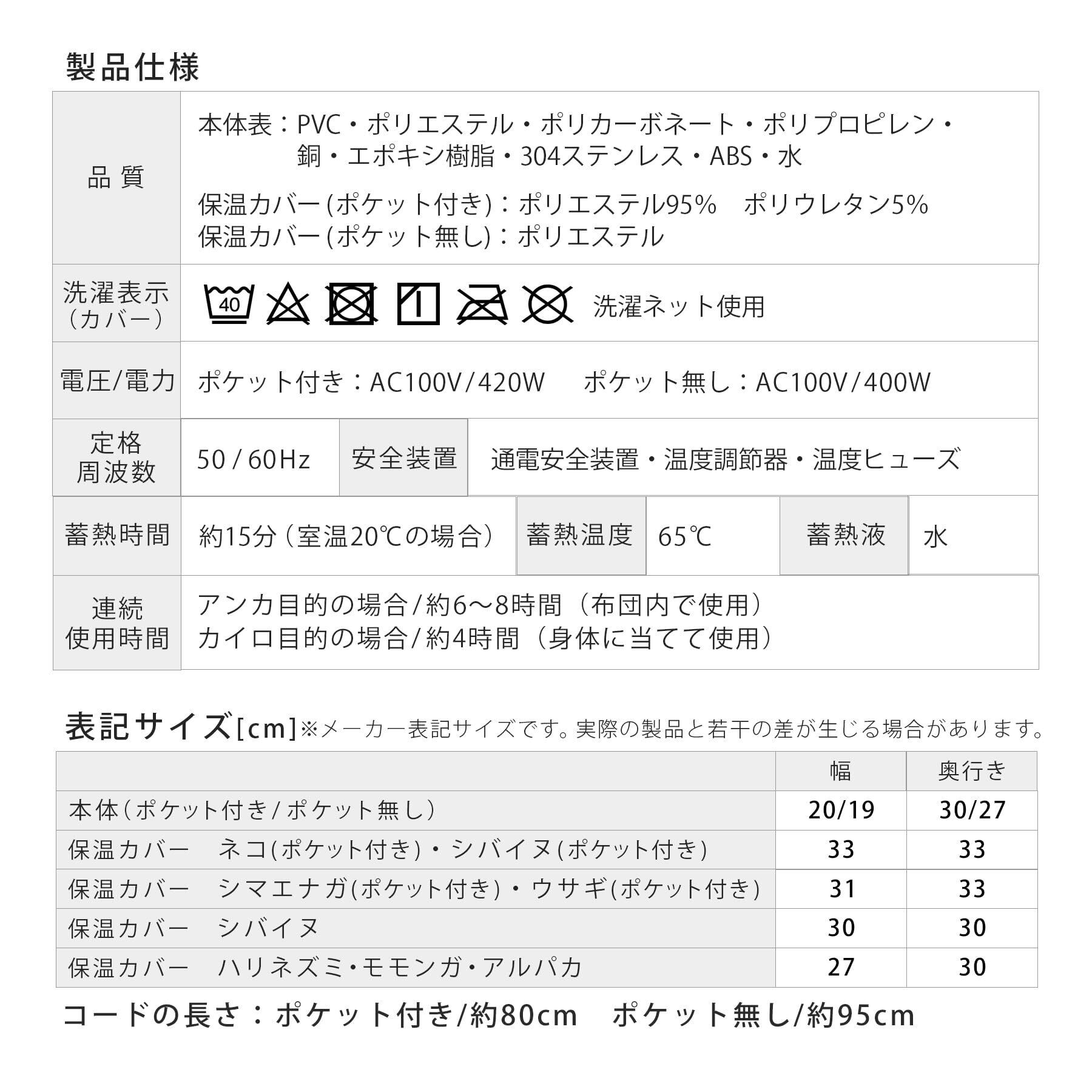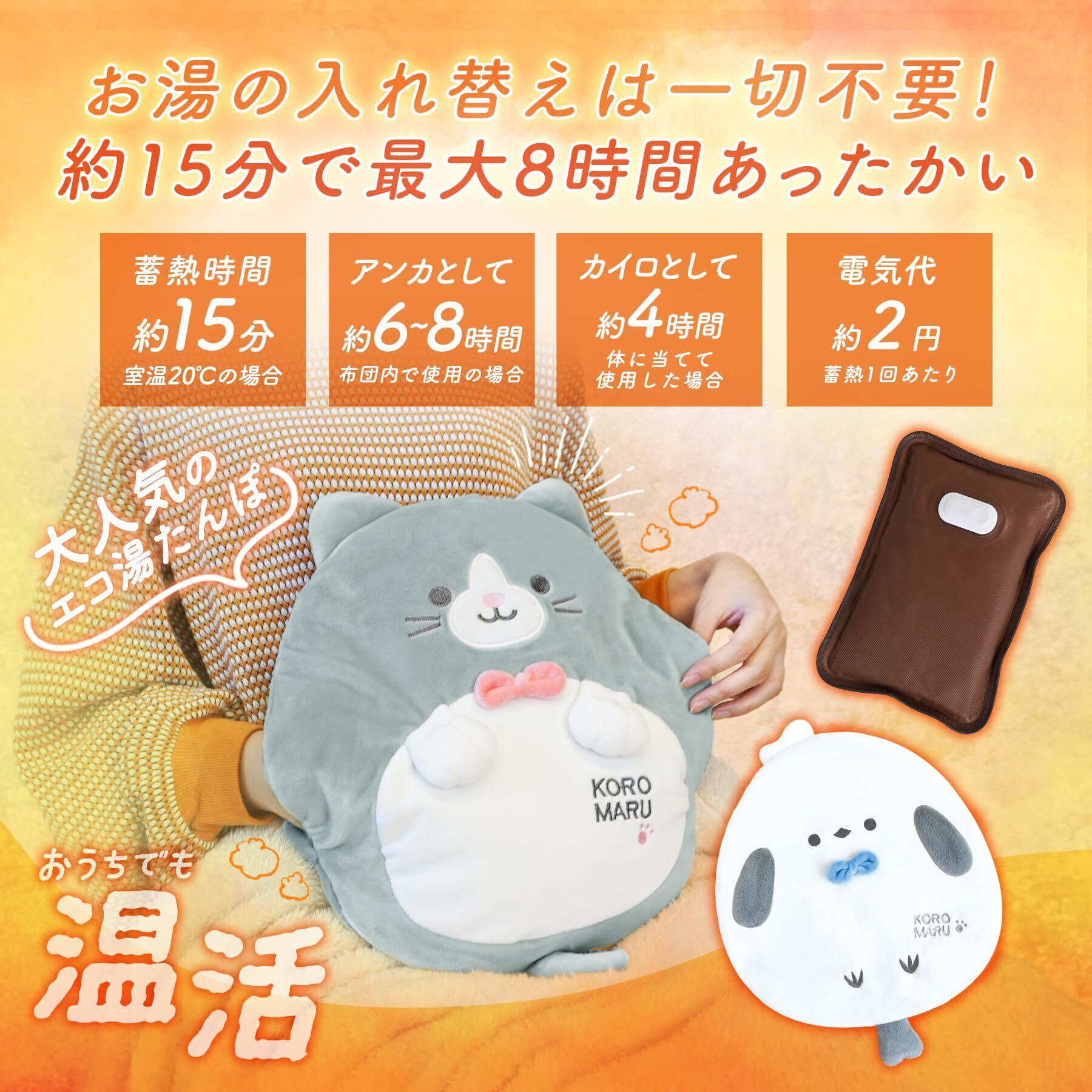 蓄熱1回あたりの電気代は約2円で家計にも優しい。体に当ててカイロとして使用した場合は約4時間、布団の中でアンカとして使用した場合は約6~8時間、あたたかさが持続します。