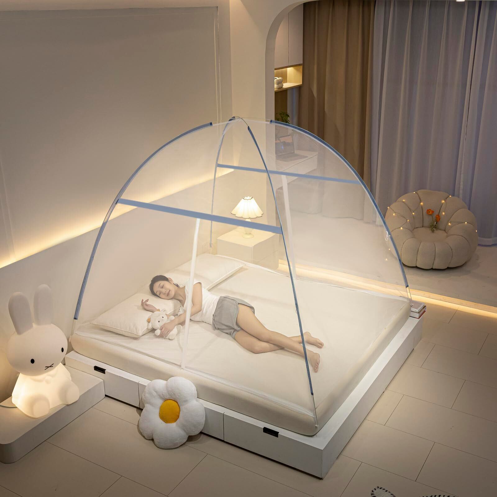 蚊帳 テント ワンタッチ 【2025改良型・折りたたみ・底生地付き】 かや モスキートネット ベッドテント 虫よけ 蚊よけ ムカデ対策 組み立て簡単 収納便利 通気性 高密度 夏用 (ネイビーブルー, 150*200*155cm)