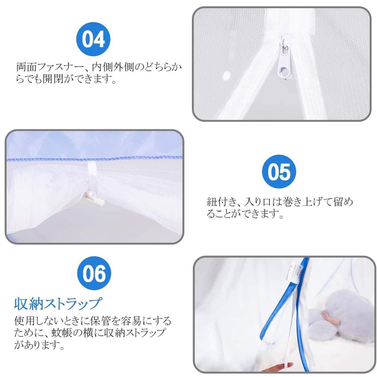【底面付きタイプ】底面があるタイプなので、害虫が床から侵入する心配もありません。それから、底もメッシュなので、通気性ばっちり。梅雨の時期でも、カビなどを心配することがありません。殺虫剤、忌避剤や駆除剤など、または蚊取り線香を使うと、科学製品でなんか不安でしょう?これで物理的に遮断してぐっすり眠れそうで安心、しかも安全!
