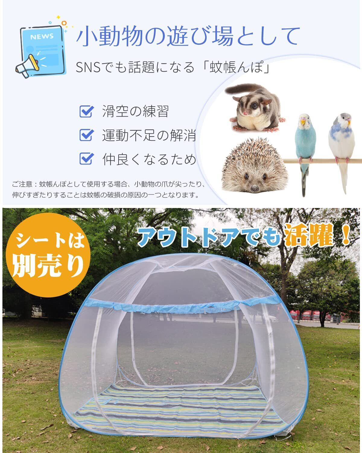 【ワンタッチ簡単設置】面倒な組み立て不要!開くだけで即使用可能なワンタッチ式蚊帳で、室内のベッド用はもちろん、モモンガ蚊帳、キャンプやアウトドアとしてもすぐに使えます。収納袋付き、コンパクトに折りたたみ可能で持ち運び便利です。
