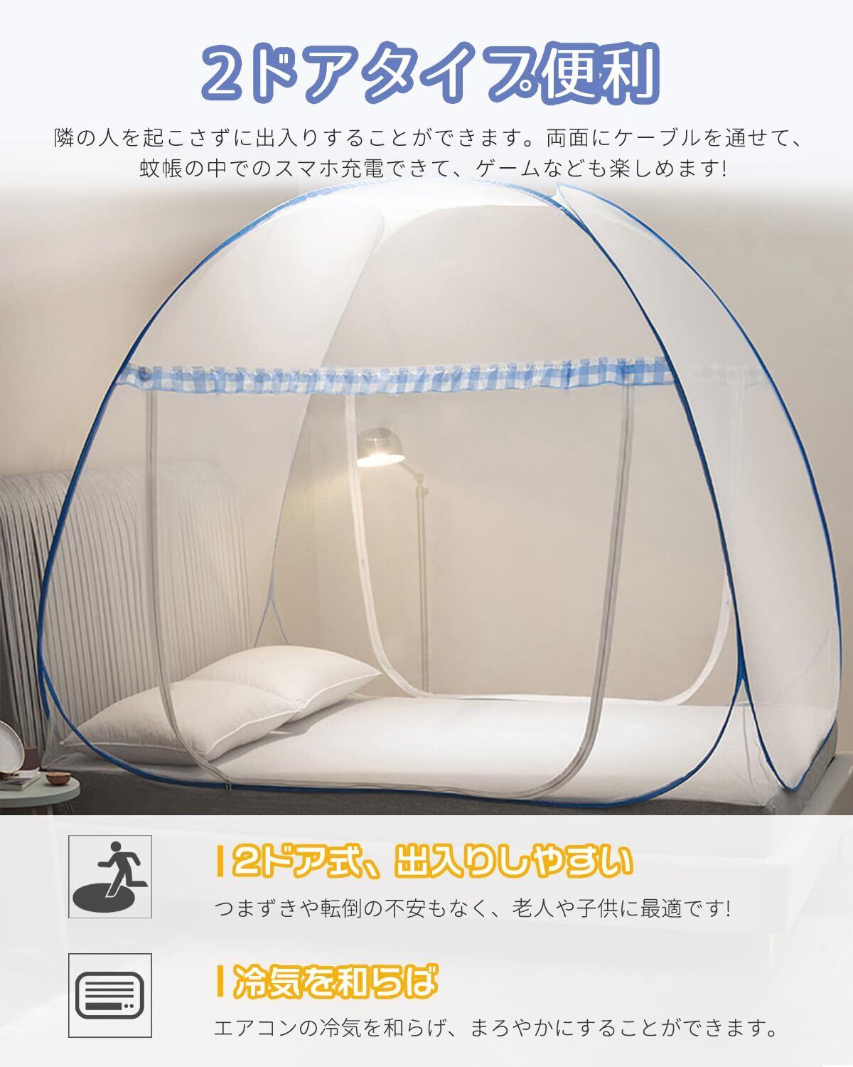 【高密度メッシュ生地で快適通気】通気性と防虫性を兼ね備えた高密度メッシュを採用、虫の侵入を防ぎつつ、空気をしっかり通すので蒸れにくく、寝苦しい夏でも安心して眠れます。底面にも細かいメッシュで、蚊やハエ、蜘蛛、ゴキブリなどの侵入を徹底ブロックできます。
