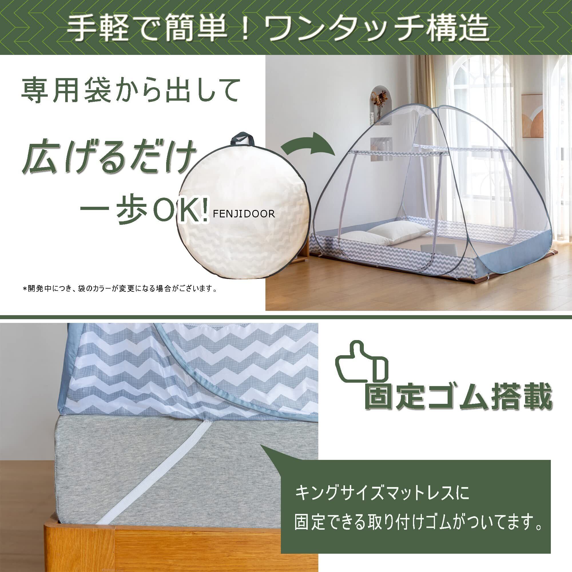 【ワンタッチ式】ワンタッチ式なので3つステップで蚊帳を広げることができて、面倒な組み立てがなくてとても便利です。パッケージ内容: 蚊帳本体(ダストバッグ包装)×1 収納袋×1 日本語説明書×1