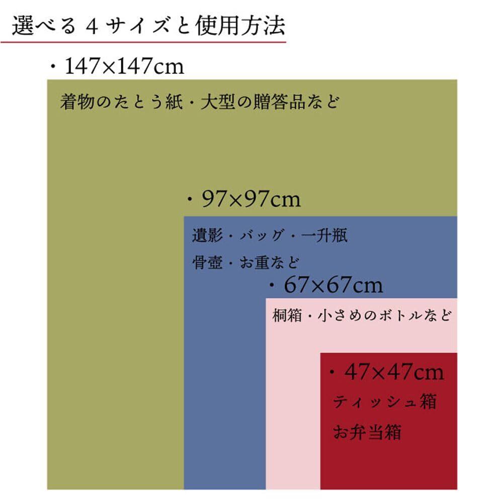 【ポイント】日本の伝統文化のひとつ風呂敷。1枚は持っておきたいスグレモノ!ご挨拶まわりや法事にはもちろん、ちょっとした身の回りの整理やエコバッグにも使えます。多種多様なサイズとカラーからイメージにピッタリのものをお選びいただけます。