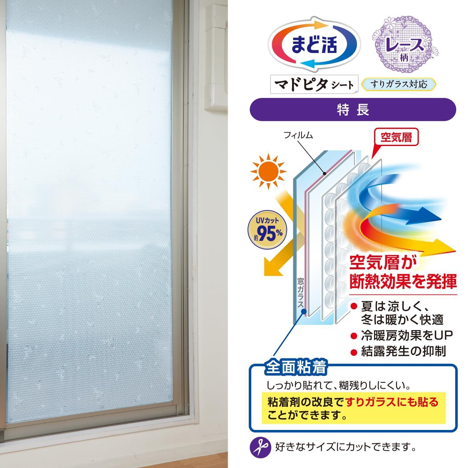 アール(R) 水もテープもいらない マドピタシート (日本製/すりガラス対応/全面粘着) 4層構造で冷暖房効率アップ (UVカット/結露抑制/窓ガラス飛散防止) カット可能 レース 90×180cm H-152