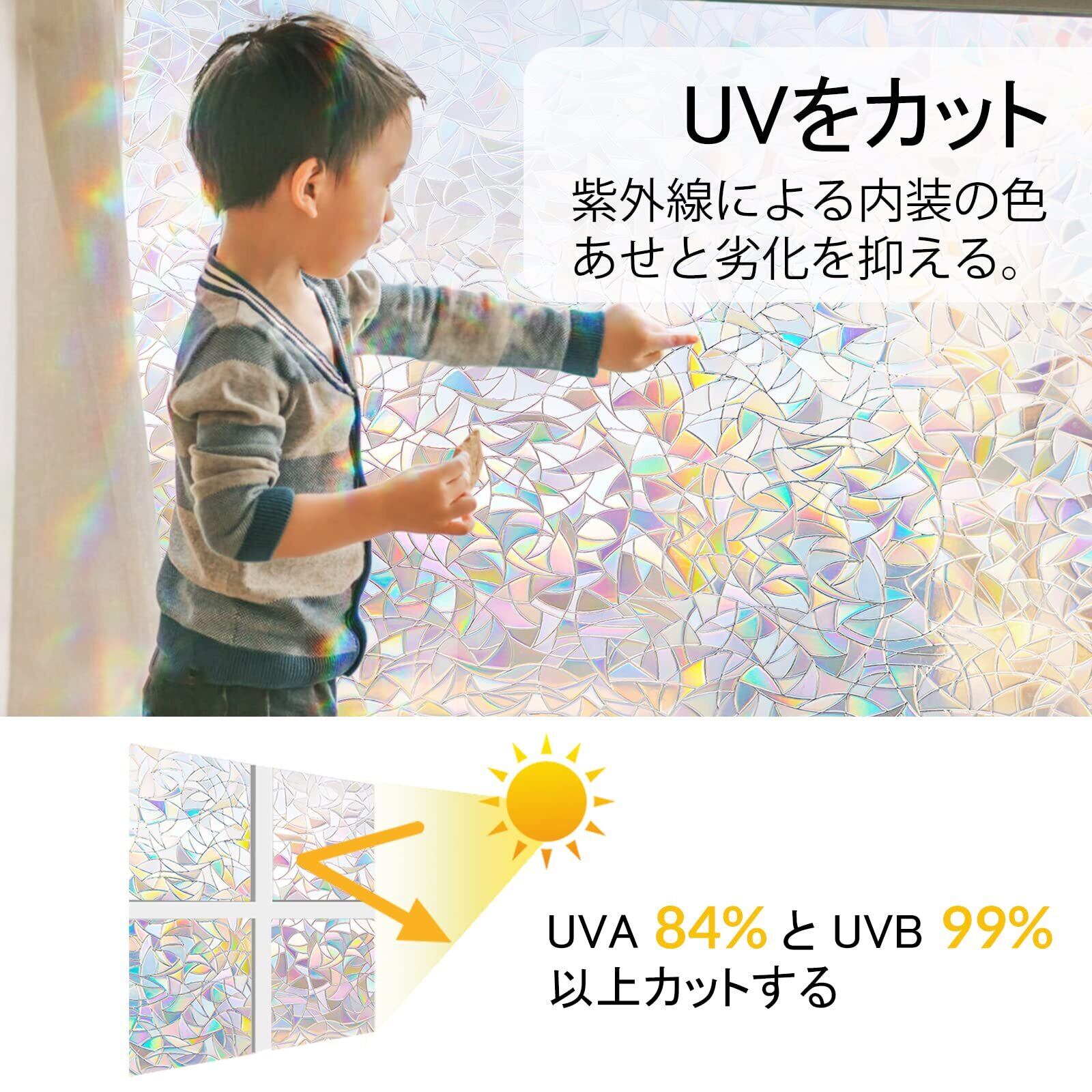 目隠し・UVカット:日差しやライトの光などのあたる所にはれば、虹色になったりし、可視光を反射して目隠しになったりします。光が強ければ強いほどカラフルになります。また、紫外線UVA 84%・UVB99% 以上カットし、際の家具や床材の劣化、肌にもたらす損害を大幅軽減します。要注意:設置の成功は使い方次第です。商品の説明ページの使い方と注意事項を丁寧にお読みください。