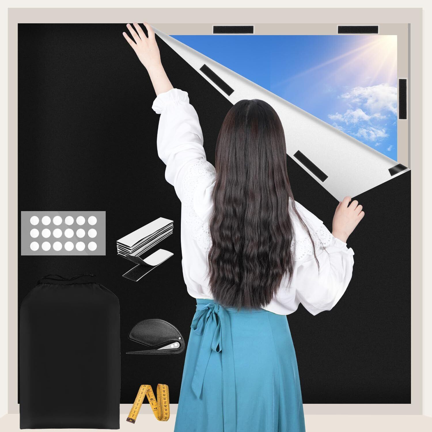 ■【貼り方2WAY・貼付簡単】水不要・接着剤不要・貼り直し不要!工具も別に用意しておりません。①:長時間遮光布の位置を変えない場合は、丸型両面無地粘着パッチを使用するのが適している。②:光を取り組みたい場合は付属の両面マジックテープを活用して、貼り付けも取り外しも便利。どんな窓にも簡単に貼り付けることができます。組み立てポイント:マジックテープは窓枠に貼り付けますから、熱割れにくいです。