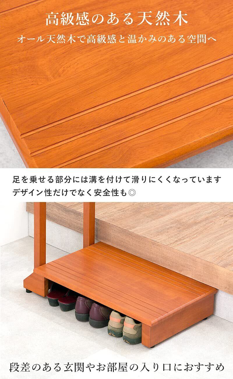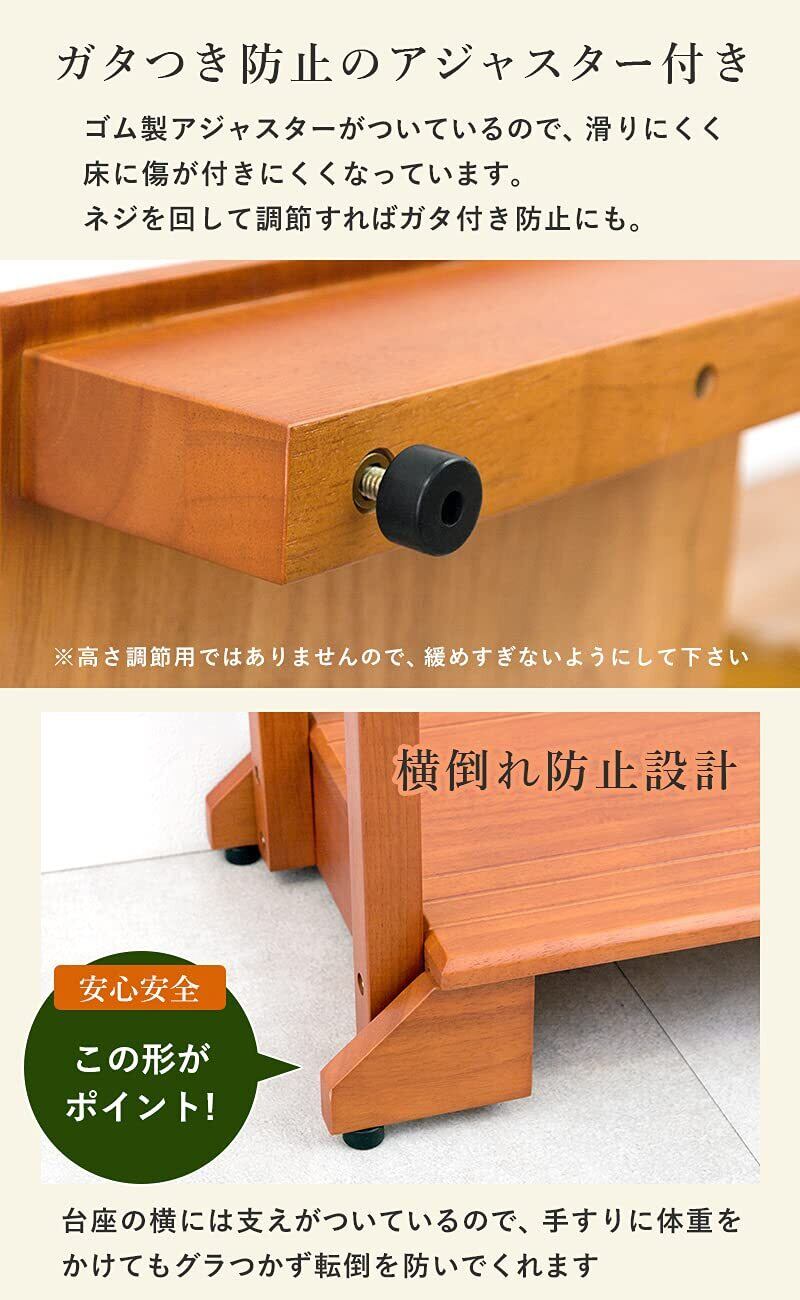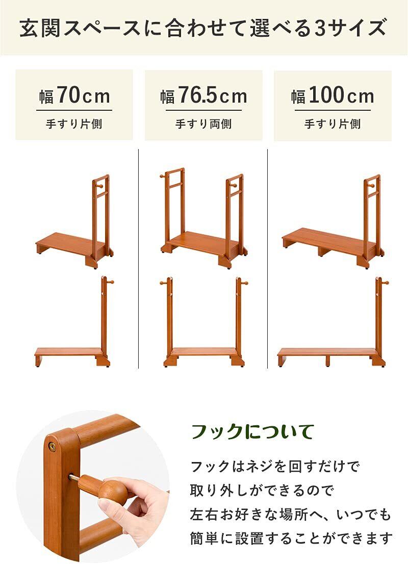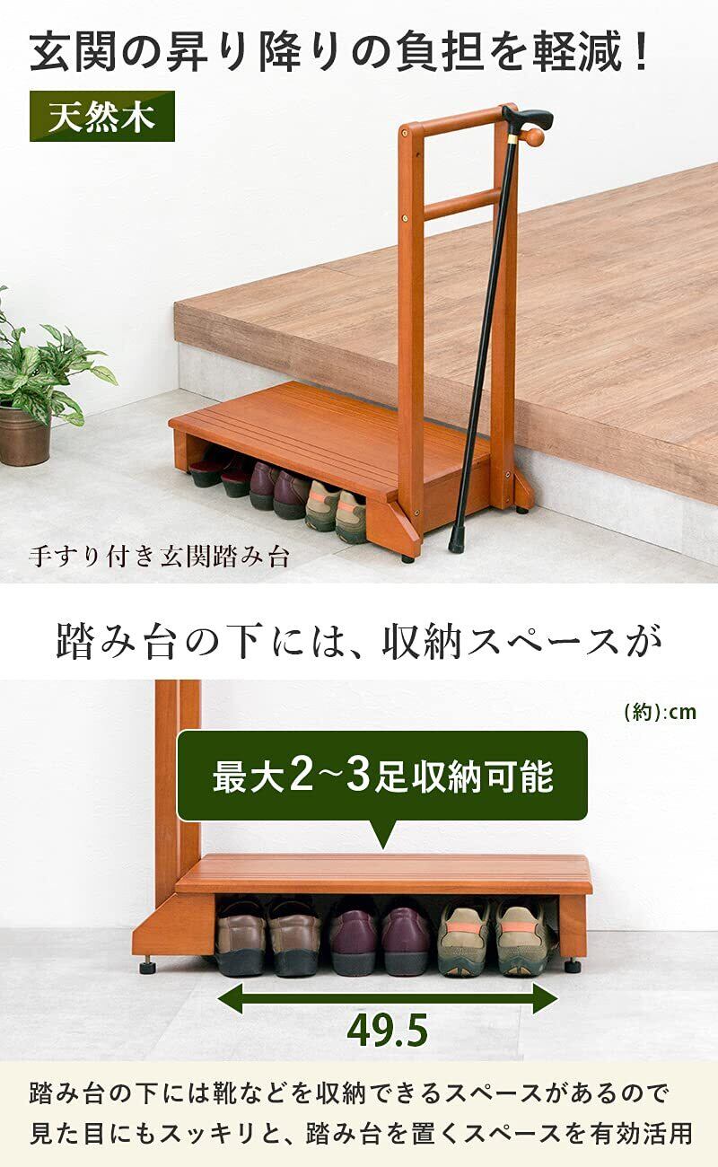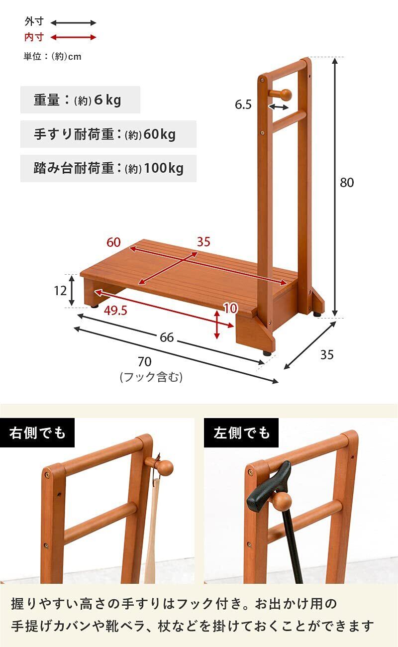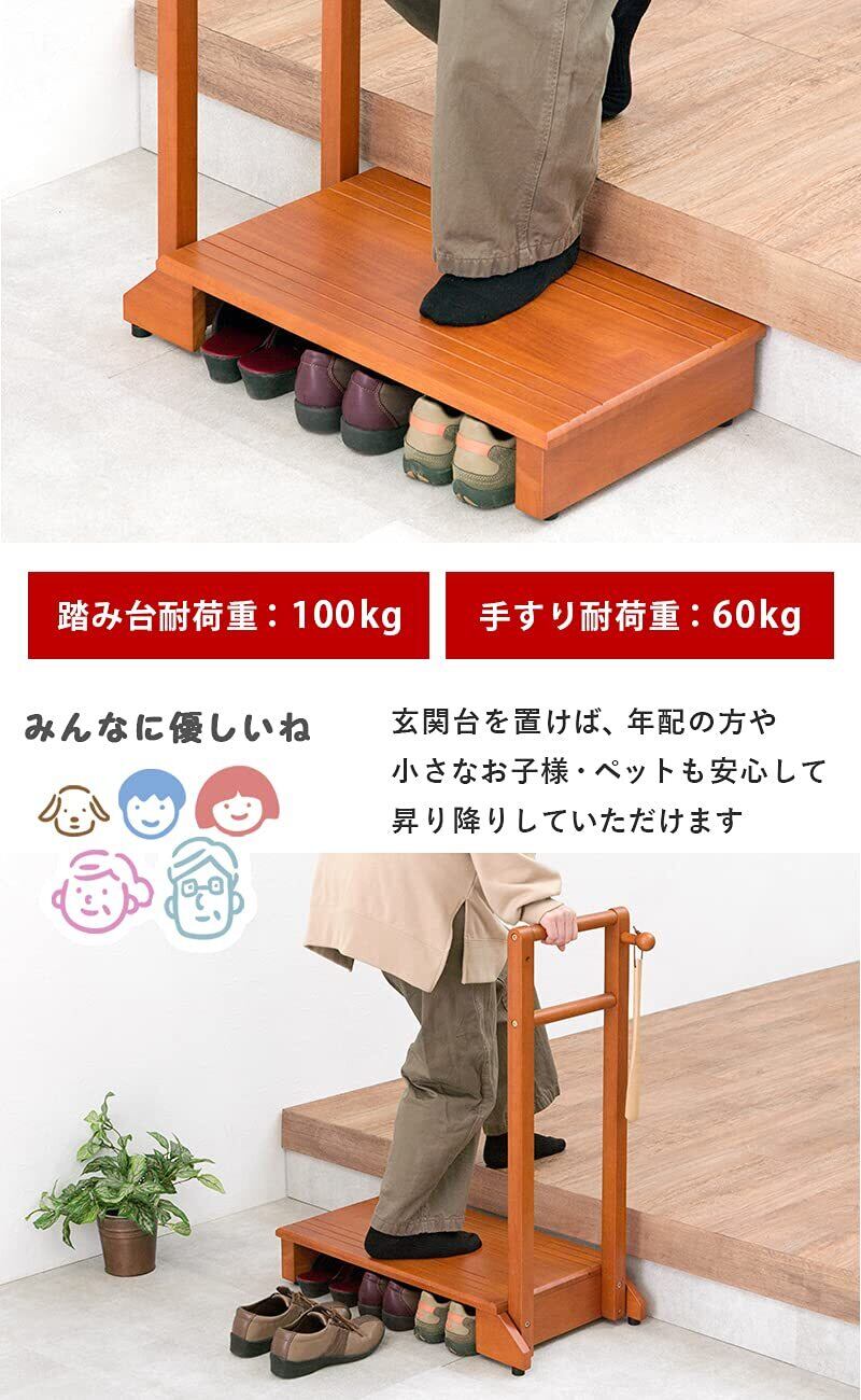 玄関や段差がある場所の上り下りが楽になる玄関踏み台。手すりが付いているので、安定して乗り降りすることができ、ひざへの負担を減らし転倒防止にもなります。高級感のある天然木は玄関のインテリアにも馴染みやすく、カバンやステッキ、杖を掛けられる便利なフック付きで台の下には靴も収納可です。ペット用としても活躍します。