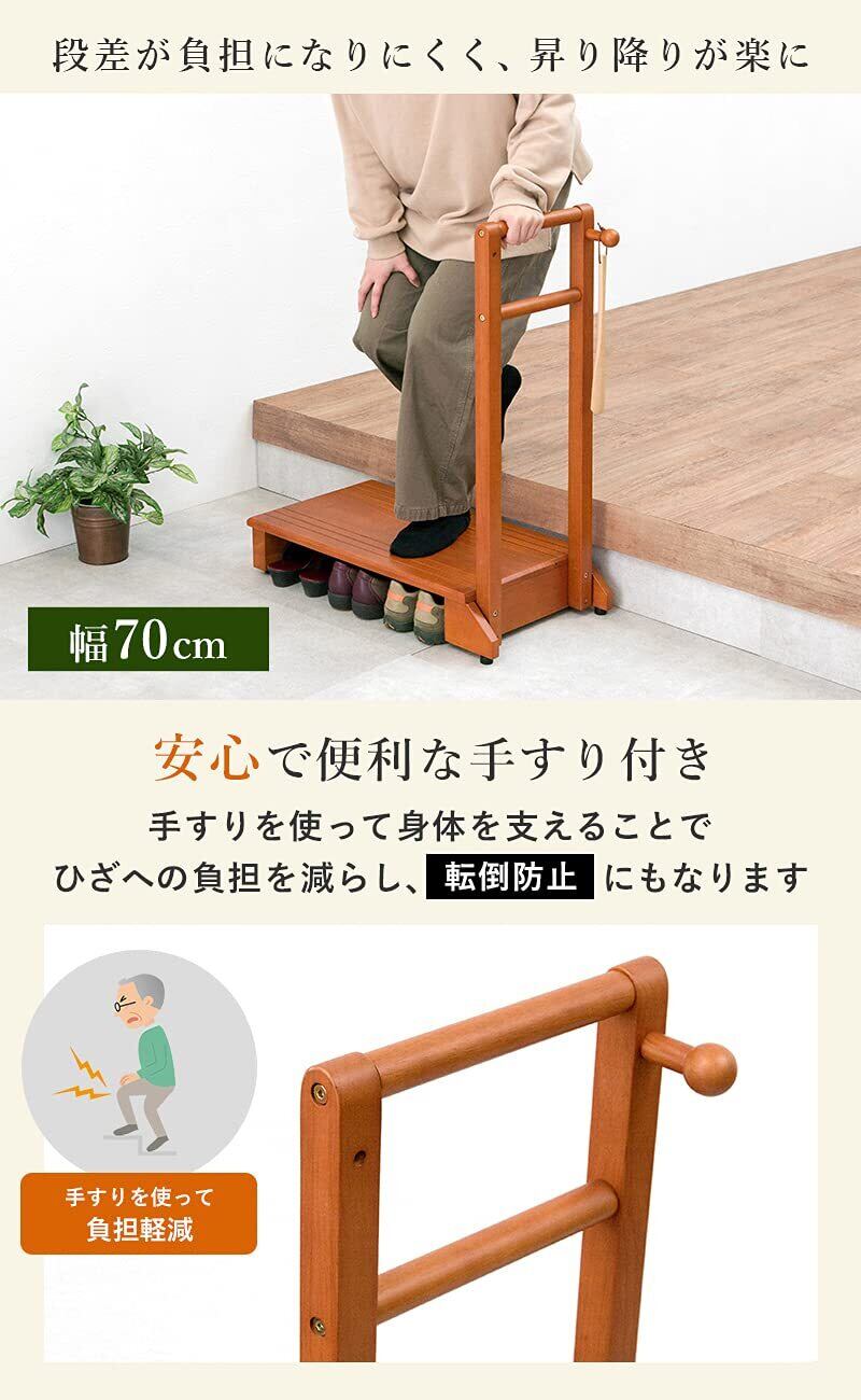 萩原(Hagihara) 玄関踏み台 玄関台 手すり付き踏み台 手すり台 スリム 【安心の耐荷重100kg】 ひざ 腰 負担軽減 子供 高齢者 ペット 幅70 ライトブラウン VH-7934LBR-S 幅70cm