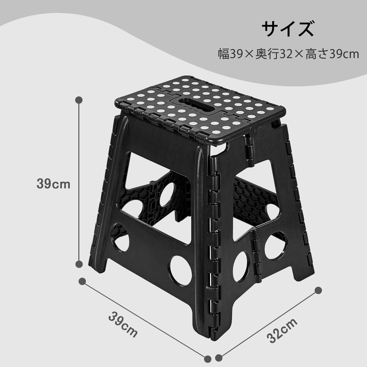 【サイズ】[使用時] (約)幅39×奥行32×高さ39cm、[収納時] 幅39×奥4×高39cm。【材質】[本体] ポリプロピレン、[滑り止め] 合成ゴム。※踏み台、ステップ 、スツール、脚立、椅子 、チェア、スタンドに。