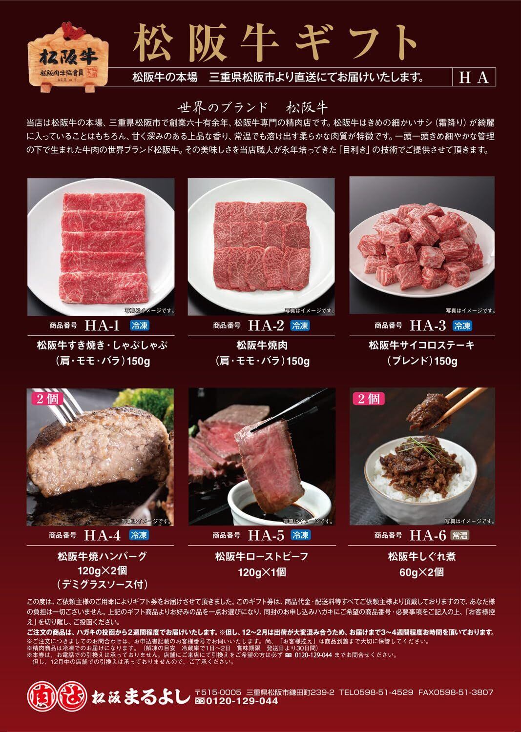 【お選びいただける商品】 ・HA-1 松阪牛すき焼き・しゃぶしゃぶ(肩・モモ・バラ)150g ・HA-2 松阪牛焼肉(肩・モモ・バラ)150g ・HA-3 松阪牛サイコロステーキ(ブレンド)150g ・HA-4 松阪牛焼ハンバーグ 120g×2個(デミグラスソース付) ・HA-5 松阪牛ローストビーフ 120g×1個 ・HA-6 松阪牛しぐれ煮 60g×2個