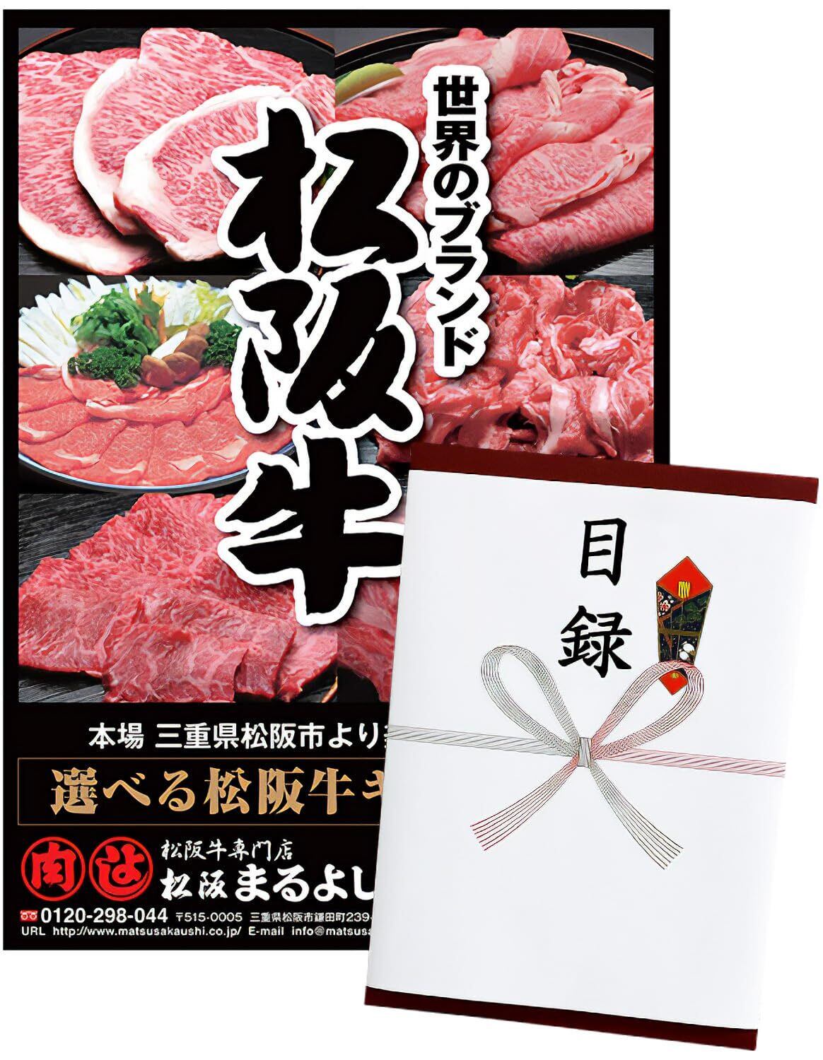 贈られた方がお好みの松阪牛商品(すき焼き・しゃぶしゃぶ・焼肉・ステーキ(サイコロ又はサーロイン))などの中から選べるから安心です。同封の専用注文ハガキやインターネットでお申込み頂いたお客様宛に、後日松阪まるよしから松阪肉を冷凍でお届けします。