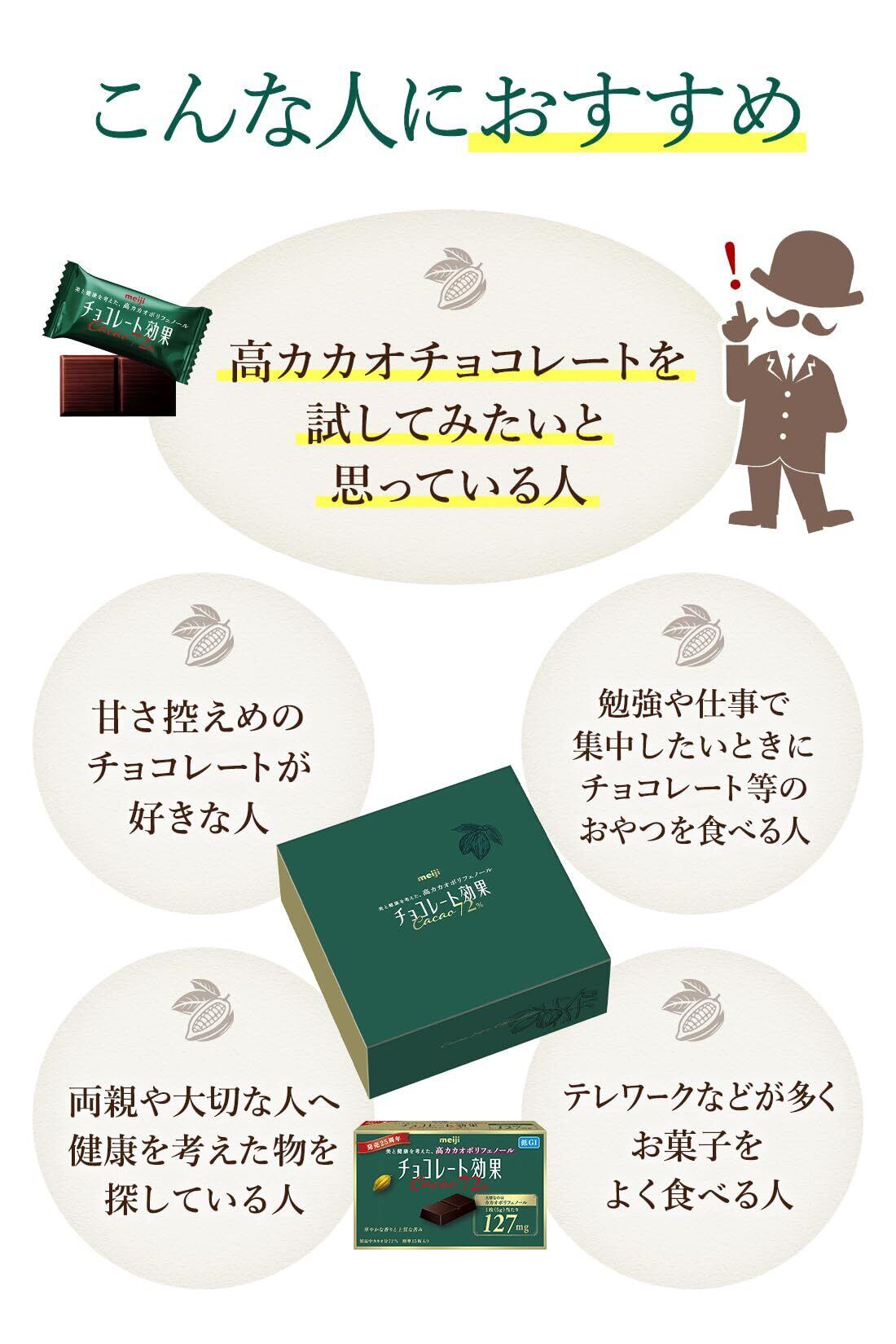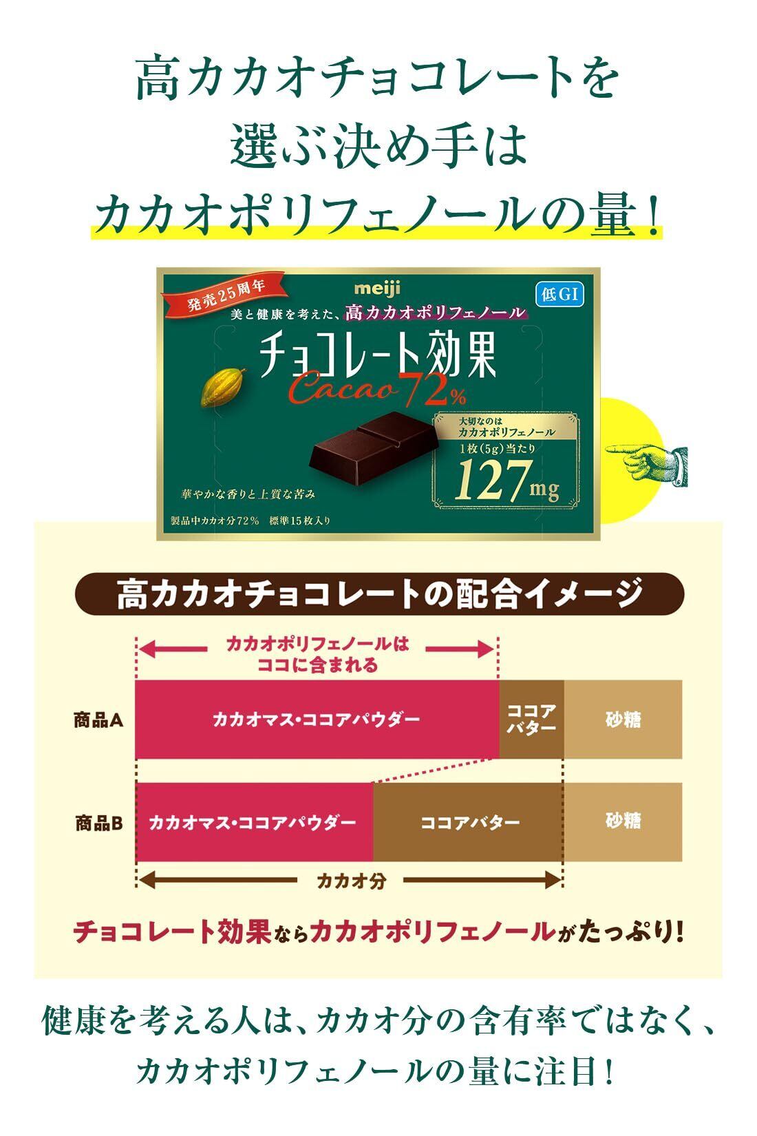 ●ちなみにチョコレート効果72 パーセントには、1枚で127mg、5枚で635mgのカカオポリフェノールが含まれます。 ※過剰摂取は推奨しておりません