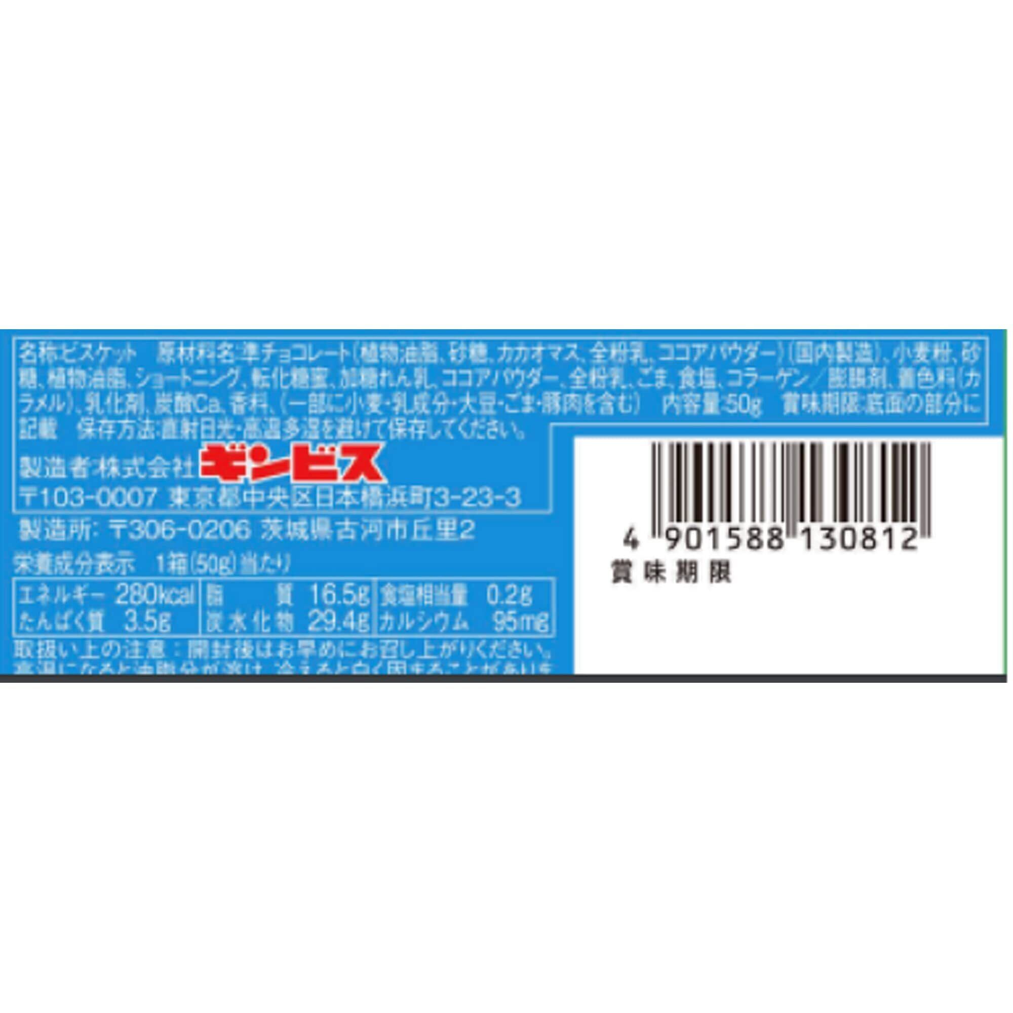 準チョコレート(植物油脂、砂糖、カカオマス、全粉乳、ココアパウダー)(国内製造)、小麦粉、砂糖、植物油脂、ショートニング、転化糖蜜、加糖れん乳、ココアパウダー、全粉乳、ごま、食塩、コラーゲン/膨脹剤、着色料(カラメル)、乳化剤、炭酸Ca、香料、(一部に小麦・乳成分・大豆・ごま・豚肉を含む)
