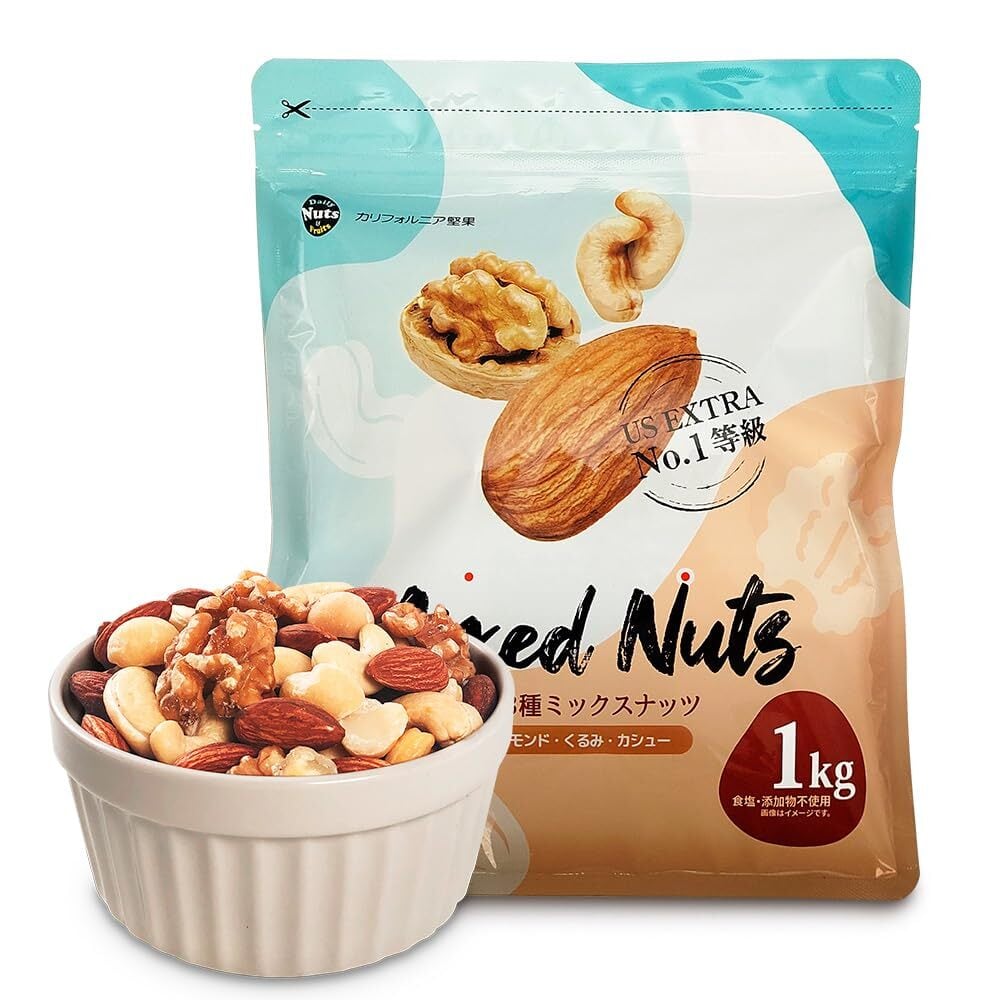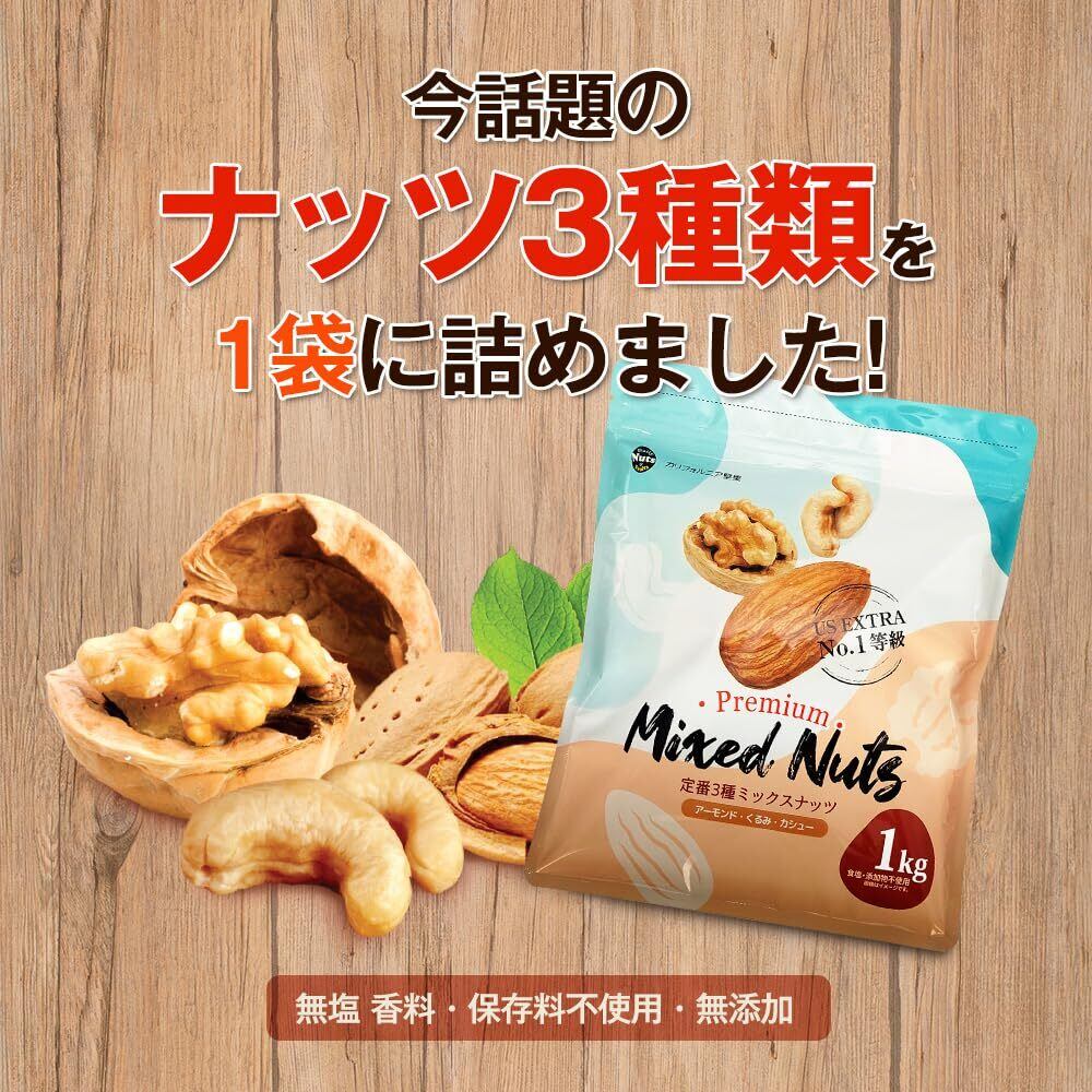 定番3種ミックスナッツ 1kg 素焼き アーモンド、くるみ、カシューナッツ 産地直輸入 食塩不使用 添加物不使用 植物油不使用