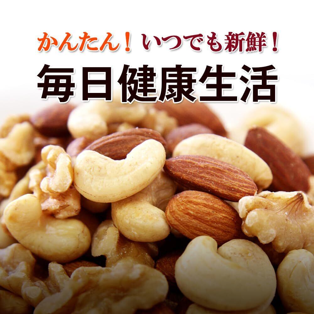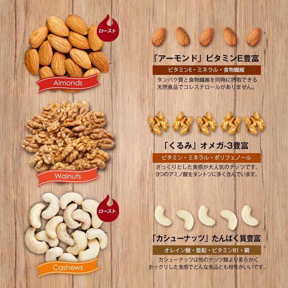 ● 原材料名:アーモンド(アメリカ産)、くるみ、カシューナッツ (アーモンド、カシューナッツは焙煎。くるみは生。)