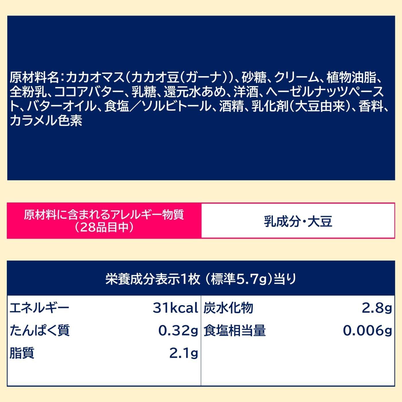 カカオマス(カカオ豆(ガーナ))、砂糖、クリーム、植物油脂、全粉乳、ココアバター、乳糖、還元水あめ、洋酒、ヘーゼルナッツペースト、バターオイル、食塩/ソルビトール、酒精、乳化剤(大豆由来)、香料、カラメル色素