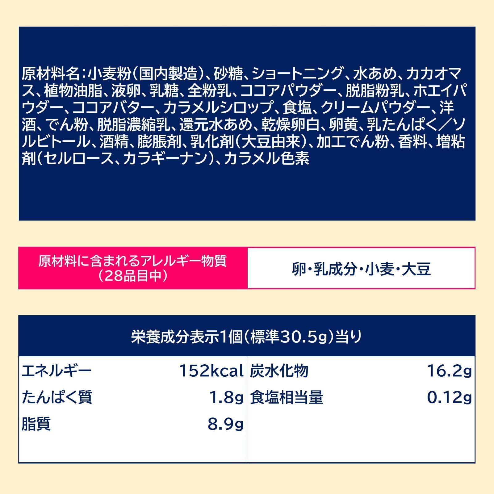 小麦粉(国内製造)、砂糖、ショートニング、水あめ、カカオマス、植物油脂、液卵、乳糖、全粉乳、ココアパウダー、脱脂粉乳、ホエイパウダー、ココアバター、カラメルシロップ、食塩、クリームパウダー、洋酒、でん粉、脱脂濃縮乳、還元水あめ、乾燥卵白、卵黄、乳たんぱく/ソルビトール、酒精、膨脹剤、乳化剤(大豆由来)、加工でん粉、香料、増粘剤(セルロース、カラギーナン)、カラメル色素