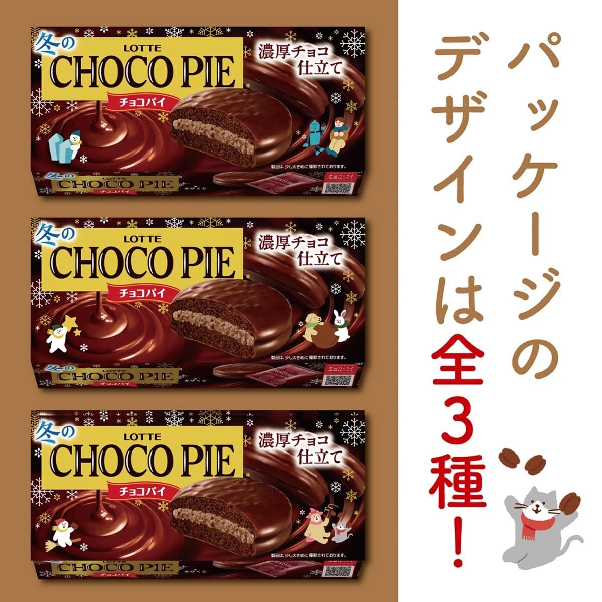 今年も冬の訪れと共に、冬のチョコパイの季節がやってきました。今年はファンタジーな雰囲気のデザインで冬のわくわく感を表現しました。しっとりとしたチョコレートケーキで芳醇なカカオのチョコレートクリームをサンドし、チョコレートでコーティングすることで、コクのある濃厚なチョコ感を楽しめる品質に仕上げています。濃厚でコク深い、冬にしか出会えないチョコパイを存分にお楽しみください。