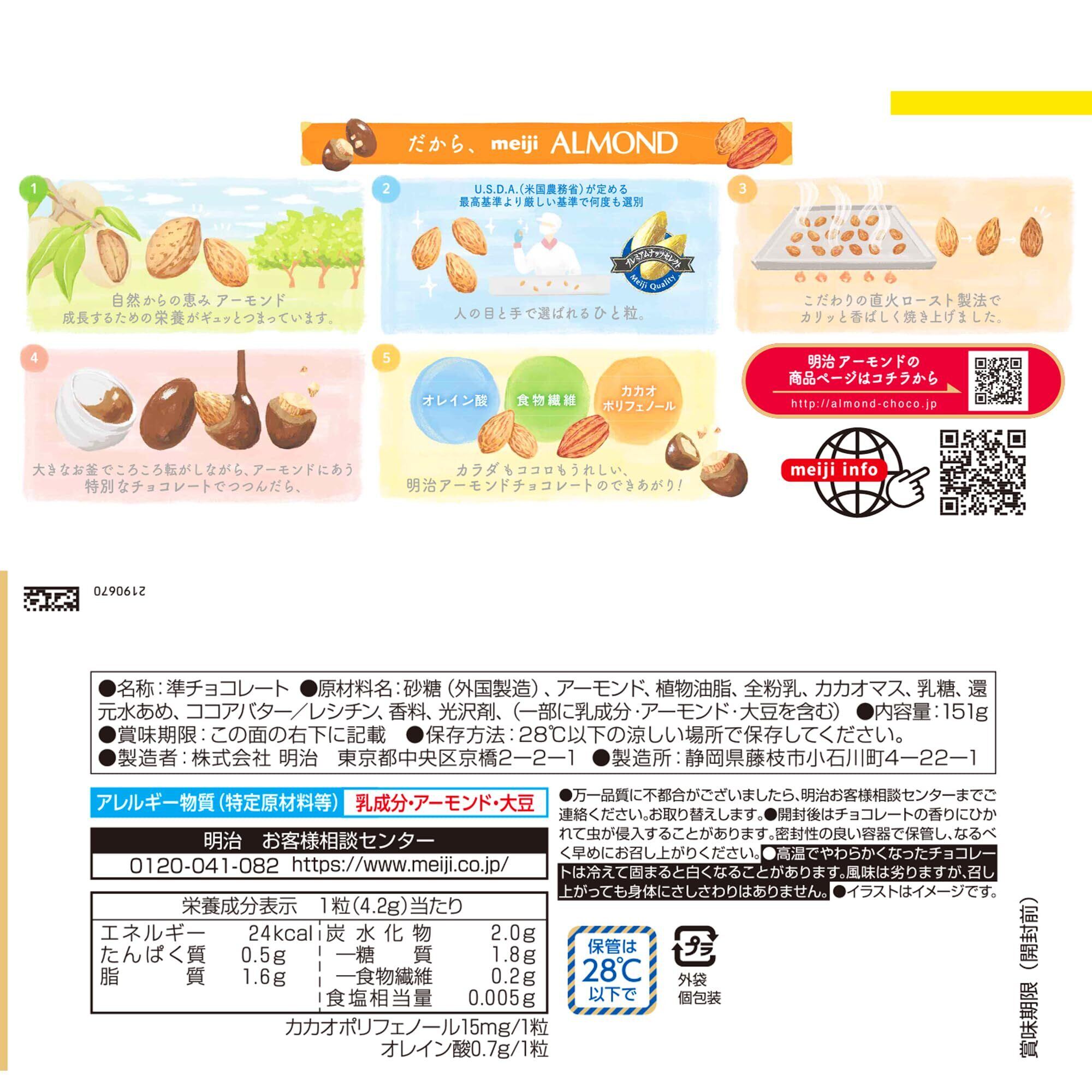 砂糖 (外国製造)、アーモンド、植物油脂、全粉乳、 カカオマス、乳糖、還元水あめ、ココアバター/レシチン、香料、 光沢剤、(一部に乳成分・アーモンド・大豆を含む)