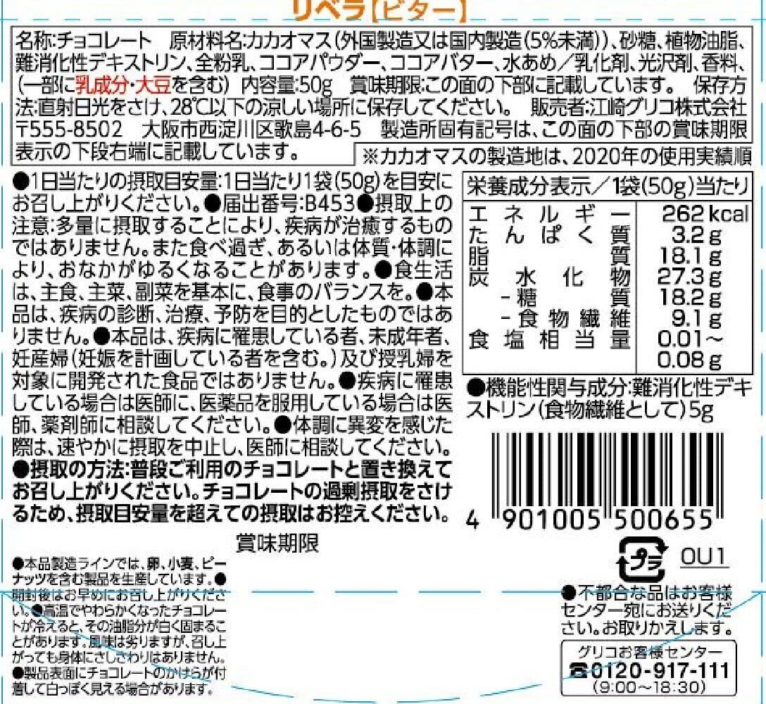 カカオマス、砂糖、植物油脂、難消化性デキストリン、全粉乳、ココアパウダー、ココアバター、水あめ/乳化剤、光沢剤、香料、(一部に乳成分・大豆を含む)