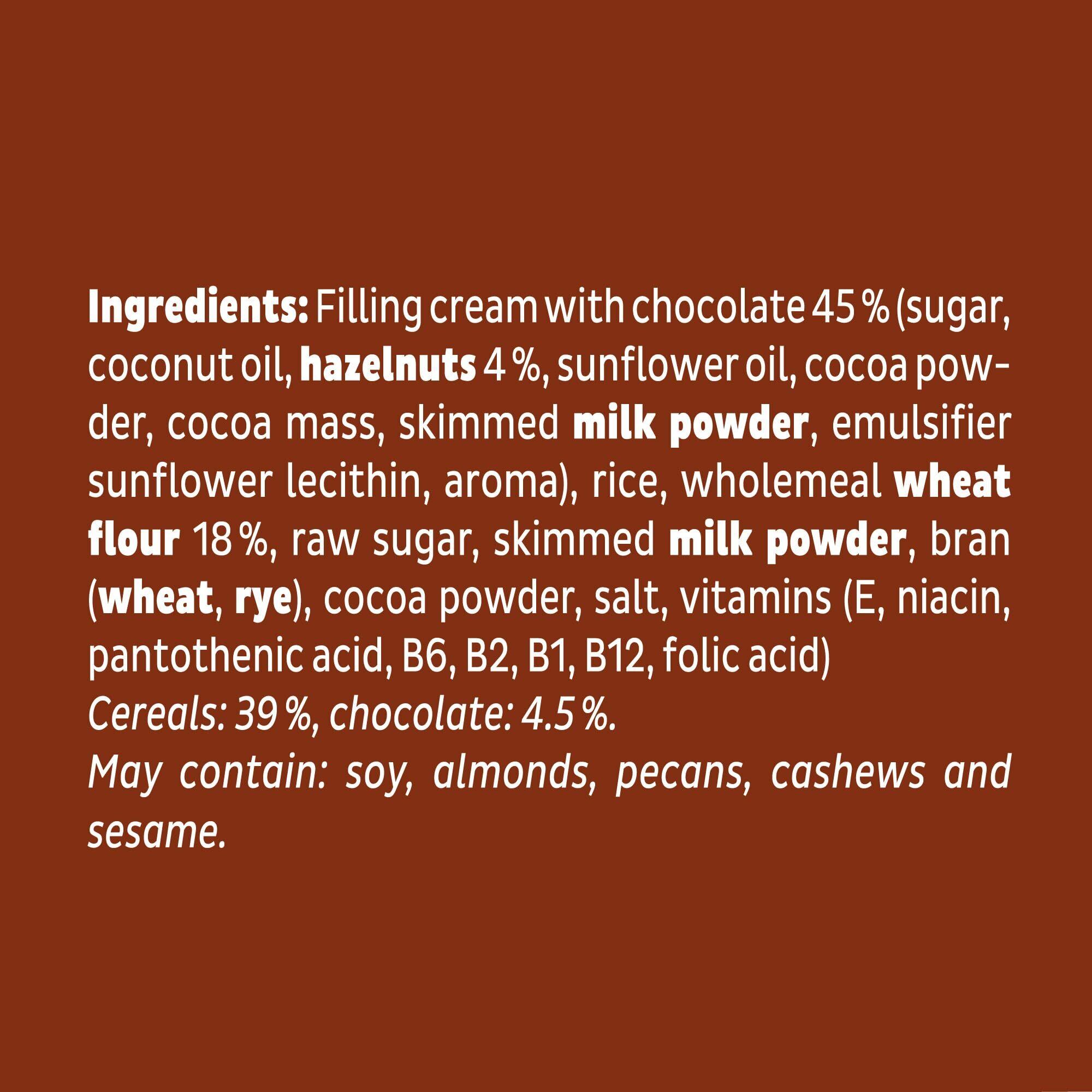 チョコレートクリームフィリング(砂糖、植物油脂、へーゼルナッツ、ココアパウダー、カカオマス、脱脂粉乳、ココアバター)、米粉、全粒小麦、粗糖、脱脂粉乳、小麦ふすま、ココアパウダー、食塩、マルトデキストリン、乳化剤(大豆由来)、香料、V.E,ナイアシン、パントテン酸Ca,V.B6,V.B2,V.B1,葉酸、V.B12
