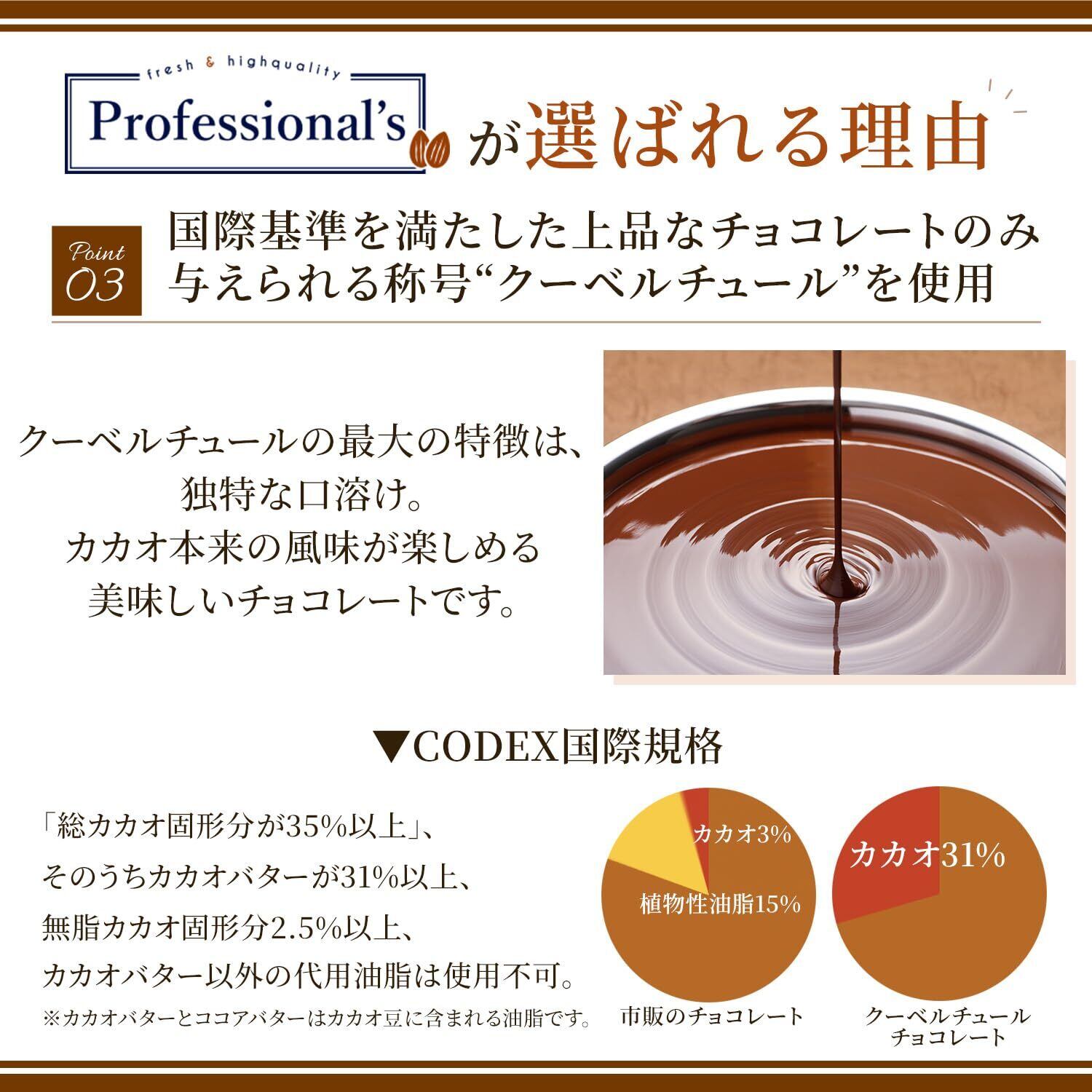 【クーベルチュールチョコレートを使用】 総カカオ固形分が35%以上、そのうちのカカオバターが31%以上、無脂カカオ固形分2.5%以上含み、カカオバター以外のパーム油等の代用油脂を使わない、国際基準を満たしたチョコレートです。製菓用としても使いやすく、特有の口どけの良さはもちろん、カカオ本来の味を楽しむことができます。