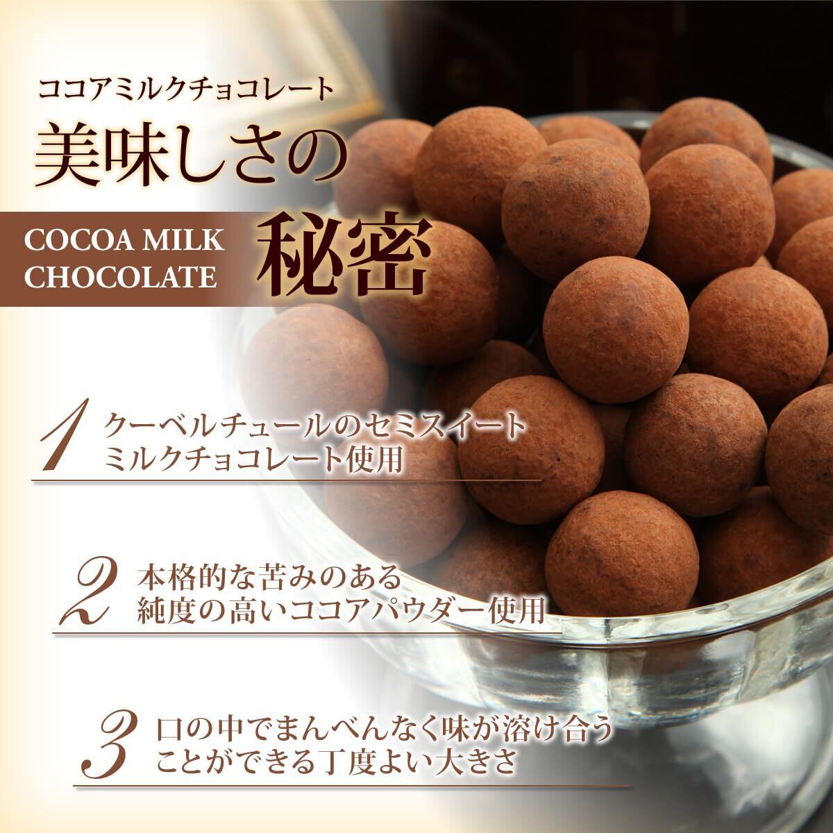 【素材のこだわり】キレのいい苦みとマイルドな甘み、コクのある風味が楽しめるセミスイートチョコレート使用。仕上げに純度の高いココアパウダーをまぶしています。