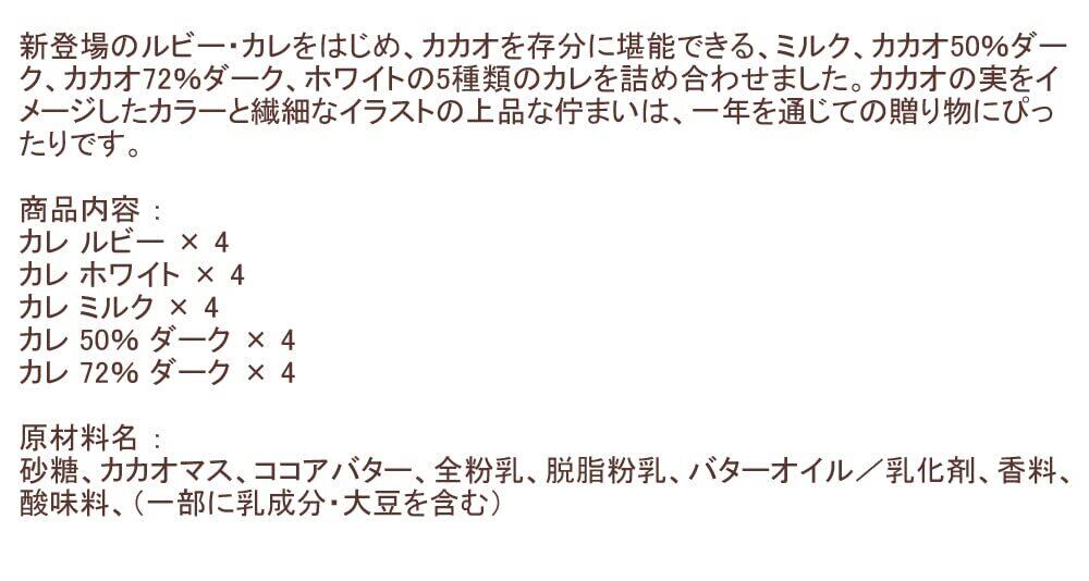 新登場のルビー・カレをはじめ、カカオを存分に堪能できる、ミルク、カカオ50%ダーク、カカオ72%ダーク、ホワイトの5種類のカレを詰め合わせました。カカオの実をイメージしたカラーと繊細なイラストの上品な佇まいは、を通じての贈り物にぴったりです。