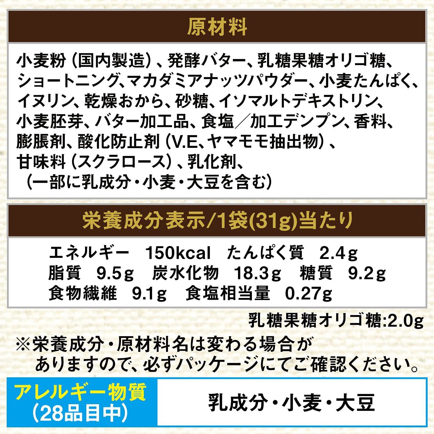 小麦粉、発酵バター、ショートニング、砂糖、マカダミアナッツパウダー、イソマルトデキストリン、乾燥おから、イヌリン、マーガリン、小麦胚芽、小麦たんぱく、豆乳パウダー、バター加工品、食塩/加工デンプン、セルロース、香料、酸化防止剤(V.E、ヤマモモ抽出物)、膨脹剤、乳化剤、甘味料(スクラロース)、(一部に乳成分・小麦・大豆を含む)