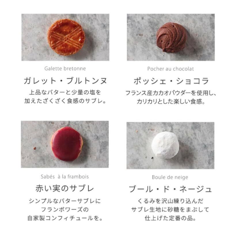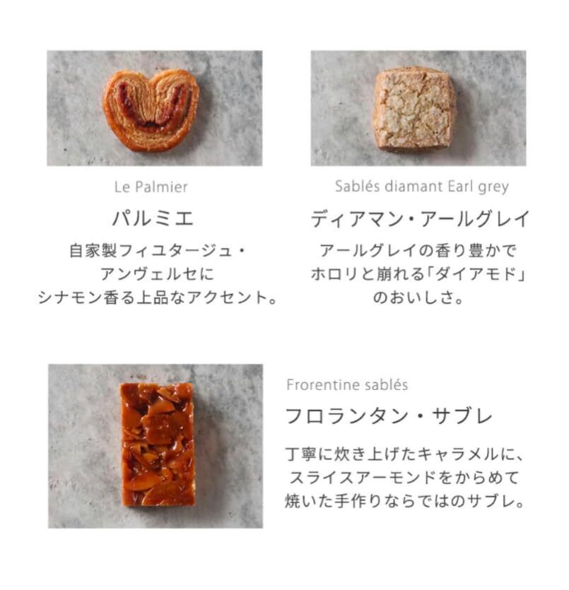 内容量・・・【赤い実のサブレ】3枚【ガレットブルトンヌ】2枚【ディアマンアールグレイ】3枚【ブールドネージュ】3個【フロランタン】2枚【ポッシェ】18g【パルミエ】3枚