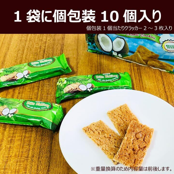 ベトナム中部の原料を使用して作られたココナッツクラッカーはクアンナム省の特産品です。 地元の自然素材にこだわって製造しています。 パリッとした口当たりと、ほどよい甘さ、ココナッツの豊かな香ばしい香りをお楽しみください。(堅めのクラッカーです) グルテンフリーのクラッカーです。