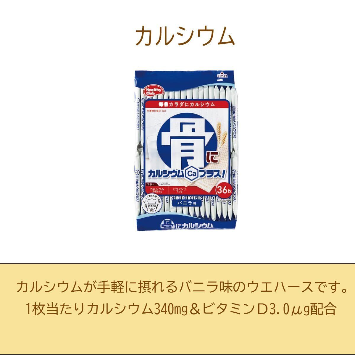 【36枚骨にカルシウムウエハース】カルシウムが手軽に摂れるバニラ味のウエハースです。1枚当たりカルシウム340mg&ビタミンD3.0μg配合