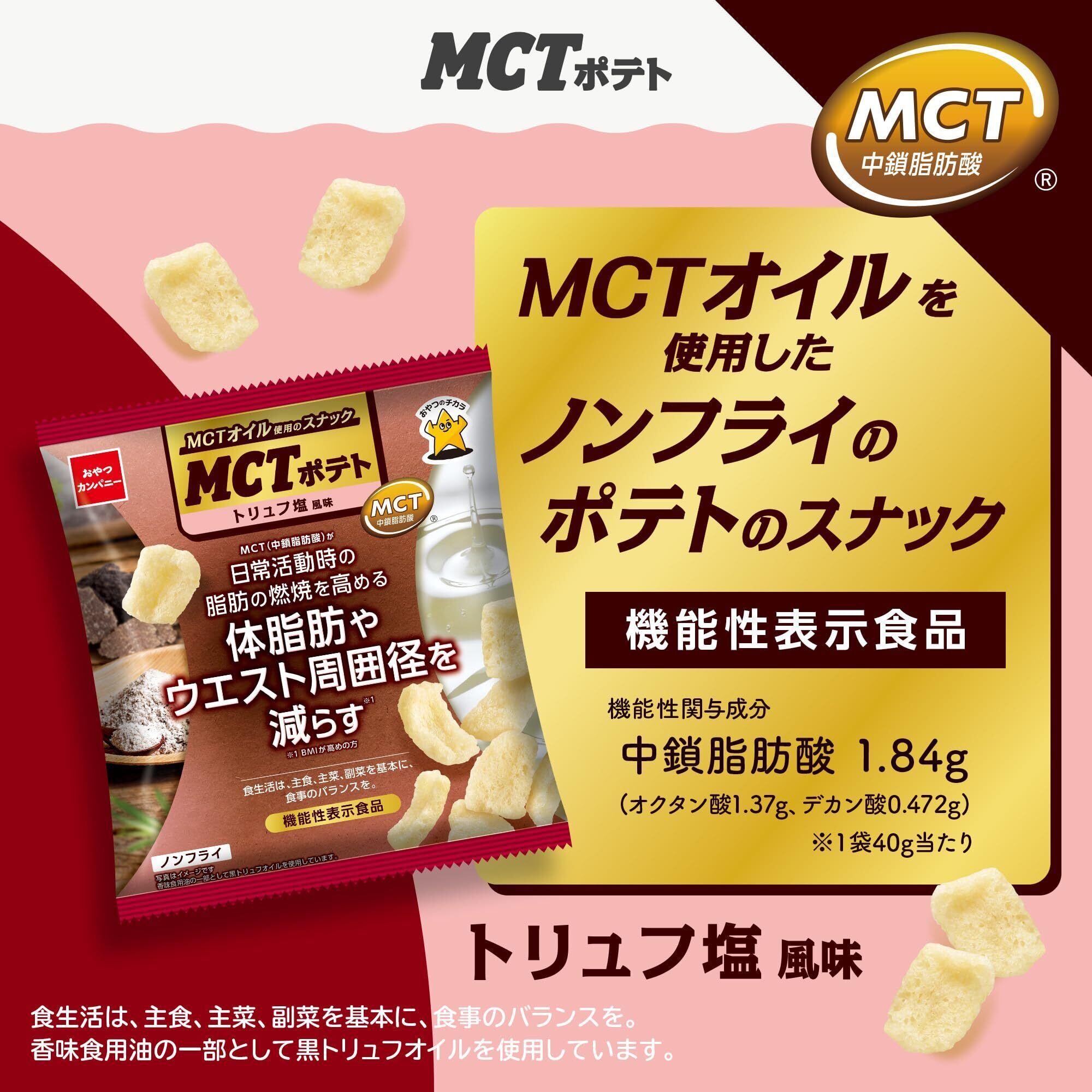 MCTオイルを使用した、ザクザク食感でノンフライのポテトスナックが新登場。トリュフ塩風味に仕上げました。”MCTポテト”は、機能性関与成分中鎖脂肪酸1.84g(オクタン酸1.37g、デカン酸0.472g)が含まれている「機能性表示食品」のポテトパフスナックです。
