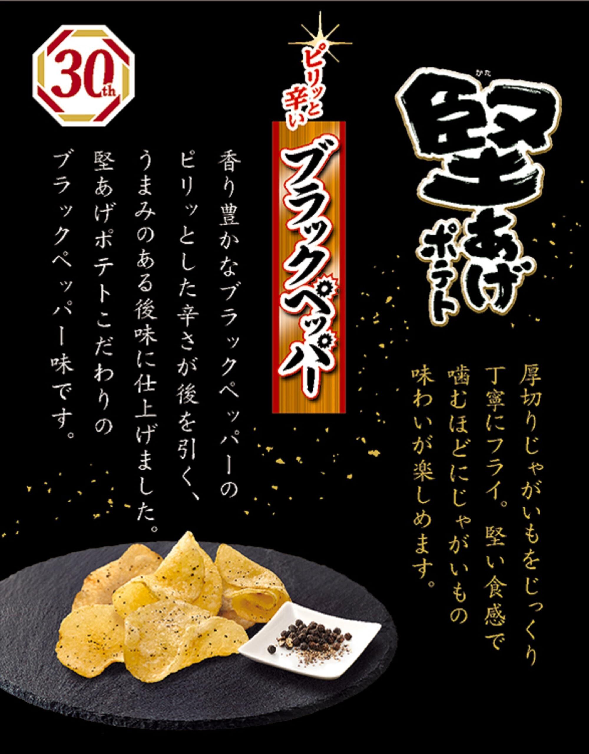 じゃがいも(国産又はアメリカ)、植物油、デキストリン、黒こしょう、食塩、砂糖、ぶどう糖、でん粉、酵母エキスパウダー(豚肉を含む)、ローストオニオンパウダー、粉末しょうゆ(小麦・大豆を含む)、発酵酵母エキスパウダー、調味動物油脂、シナモン / 調味料(アミノ酸等)、香辛料抽出物、酸味料、香料、酸化防止剤(ビタミンC)