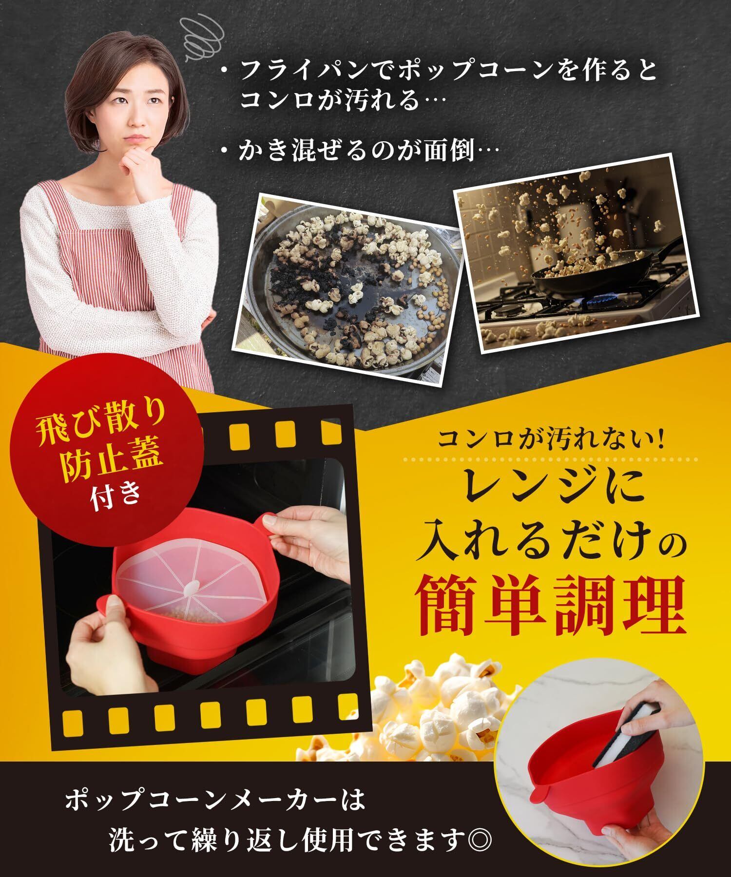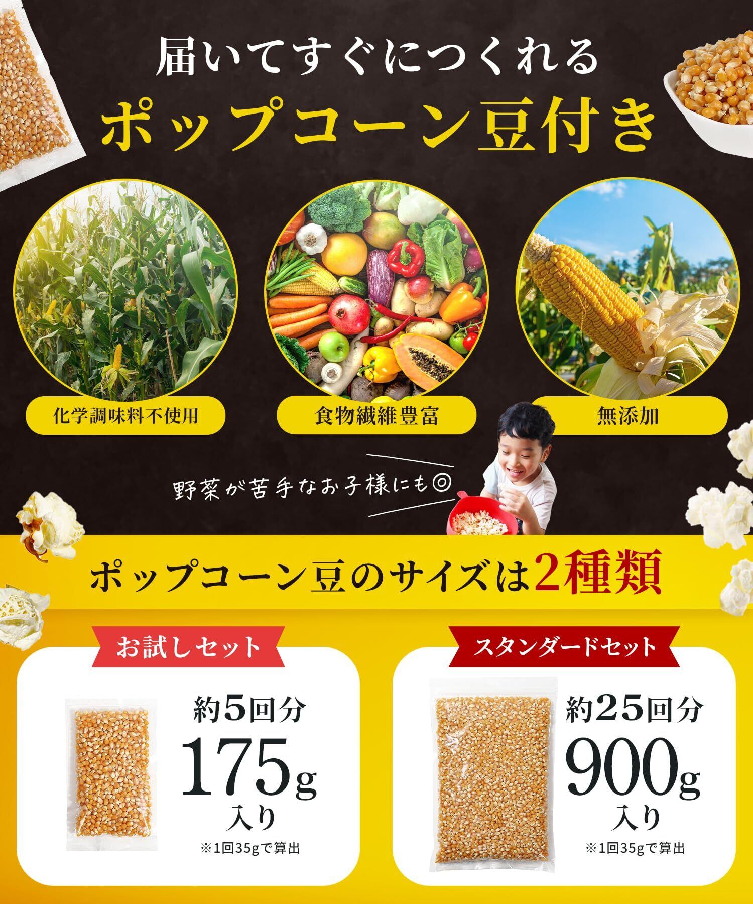 ※塩、オイルなどの調味料は付属しておりませんので、別途ご用意ください。18歳以上の大人が調理してください。ポップコーンは4歳未満の子供に与えないでください。(ポップコーン対象年齢4歳以上)
