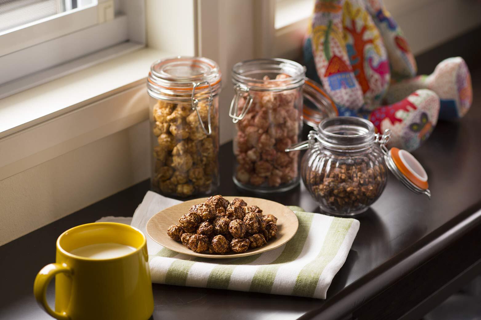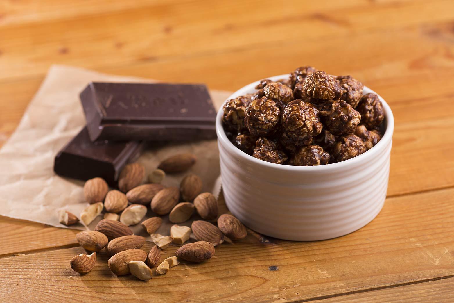 ノンオイルで熱風で仕上げる「エアーポップ製法」のマッシュルーム型ポップコーンを使用し、銅釜でトロトロに煮込んだチョコレートにこんがりローストした皮付きクラッシュアーモンドを加えた蜜で仕上げました。チョコレートの深みのある甘さと香ばしいアーモンドの相性が良く人気の逸品です。