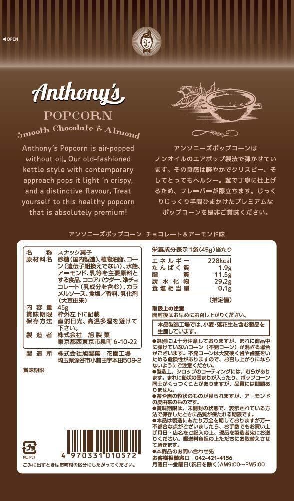 旭製菓 アンソニーズポップコーンチョコレート&アーモンド味 45g×3袋