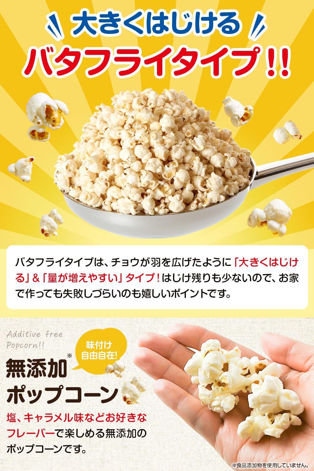 【はじける美味しさ!ポップコーン】バタフライタイプのポップコーン豆になるので、大きくはじけて仕上がりの量が増えやすいです。本場アメリカ産のPOPCORNを是非ご賞味ください。