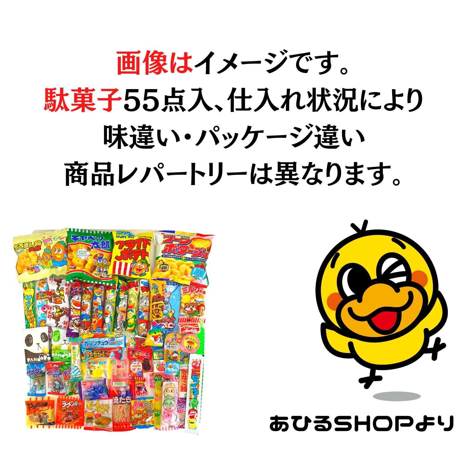 駄菓子詰め合わせお楽しみ50種55点セット+おまけおもちゃ付き お誕生日 イベントやパーティーにもどうぞ。子どもたちがデコって遊べるわくわくお菓子セット ボックス 【駄菓子屋あひるSHOP限定】 55個アソート