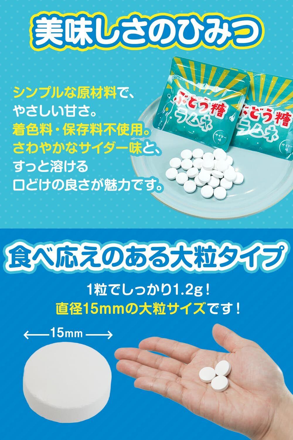 【ブドウ糖ラムネ美味しさの理由】<こだわり1>シンプルな原材料でやさしい甘さ<こだわり2>着色料・保存料不使用<こだわり3>さわやかなサイダー味と食べ応えのある大粒タイプ。※喉の詰まり防止のため、よく噛んでお召し上がりください。