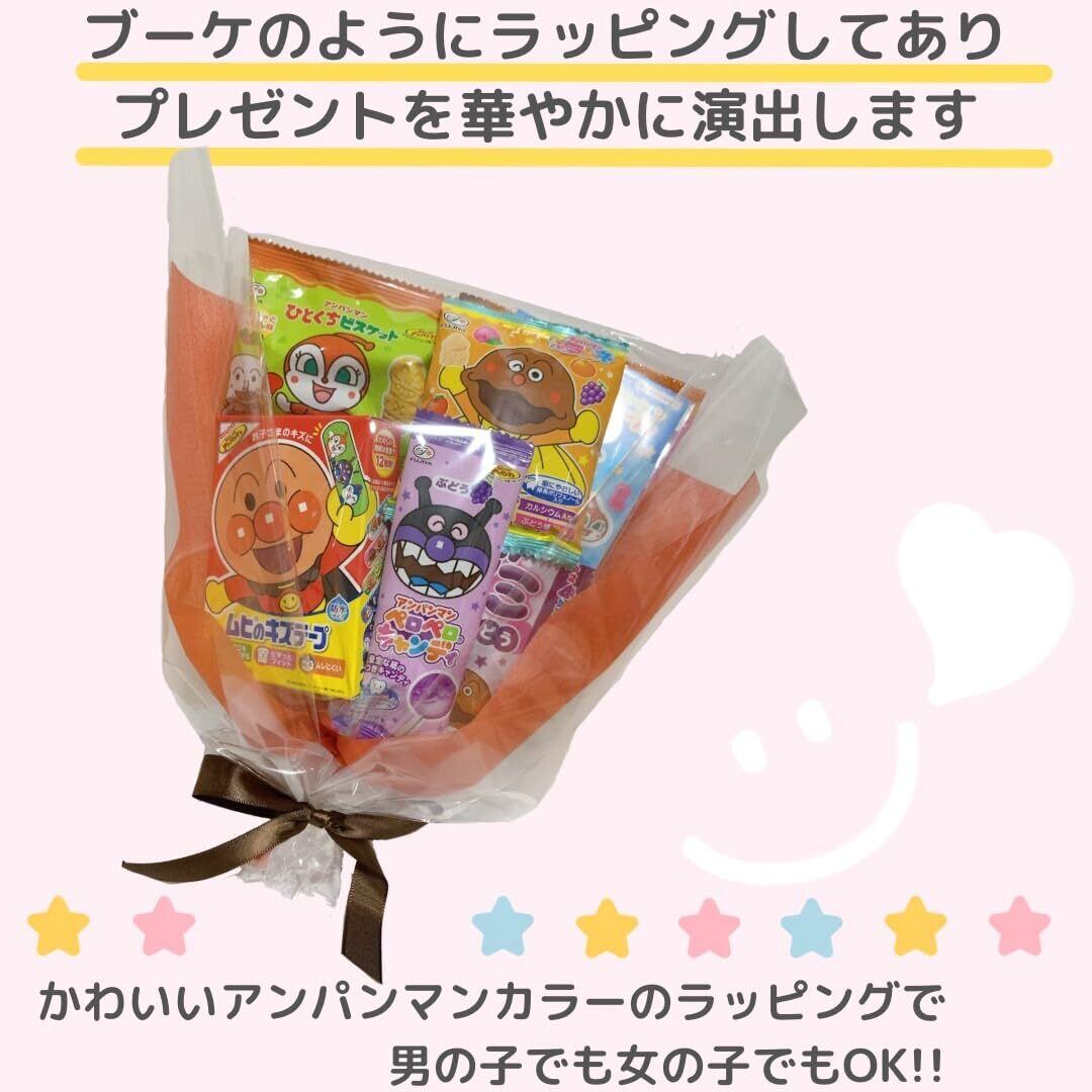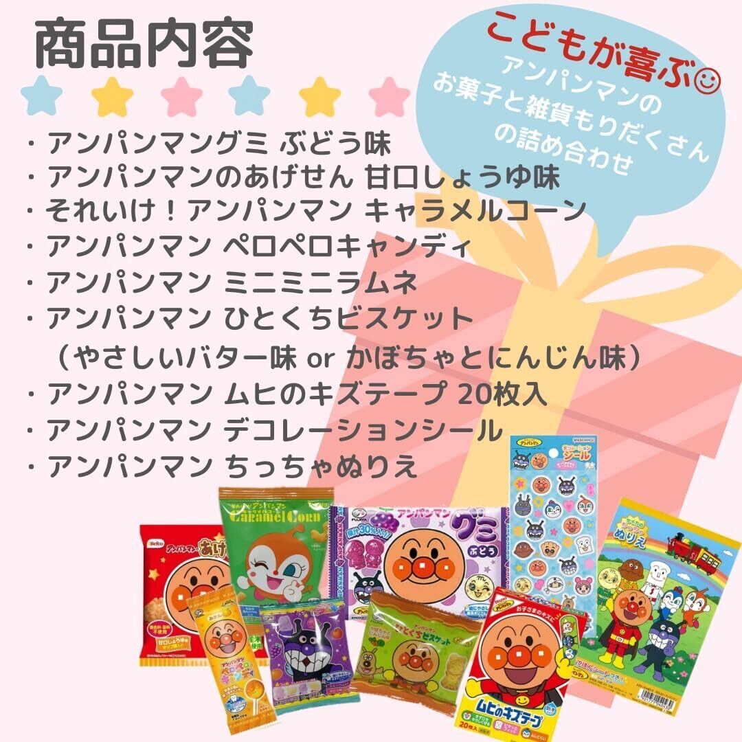 【セット内容】アンパンマンのあげせん 甘口しょうゆ味×1、それいけ!アンパンマンキャラメルコーン×1、アンパンマンひとくちビスケット×1、アンパンマングミぶどう味×1、アンパンマンペロペロキャンディ×1、アンパンマンミニラムネ×1、アンパンマン ムヒのキズテープ20枚入り×1、アンパンマンデコレーションシール×1、アンパンマンちっちゃぬりえ×1