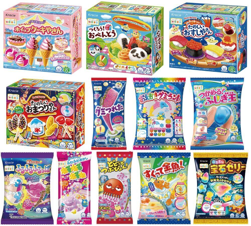 クラシエ 知育菓子12種セット ・ ドドットツブピョンぶどうソーダ, ・ ポッピンクッキンたのしいおすし屋さん, ・ ポッピンクッキンホイップケーキ屋さん, ・ グミつれたグレープ味, ・ つかめる!ふしぎ玉ぶどう、 ・ ねるねるねるねぶどう ・ すくって金魚 ・ ポッピンクッキンツクロウおべんとう ・ 魔法のゼリーふるふるふるっぱ ・ おえかきグミランド, ・ ぷるるん宝石ゼリー ・ ポッピンクッキン たのしいおまつりやさん