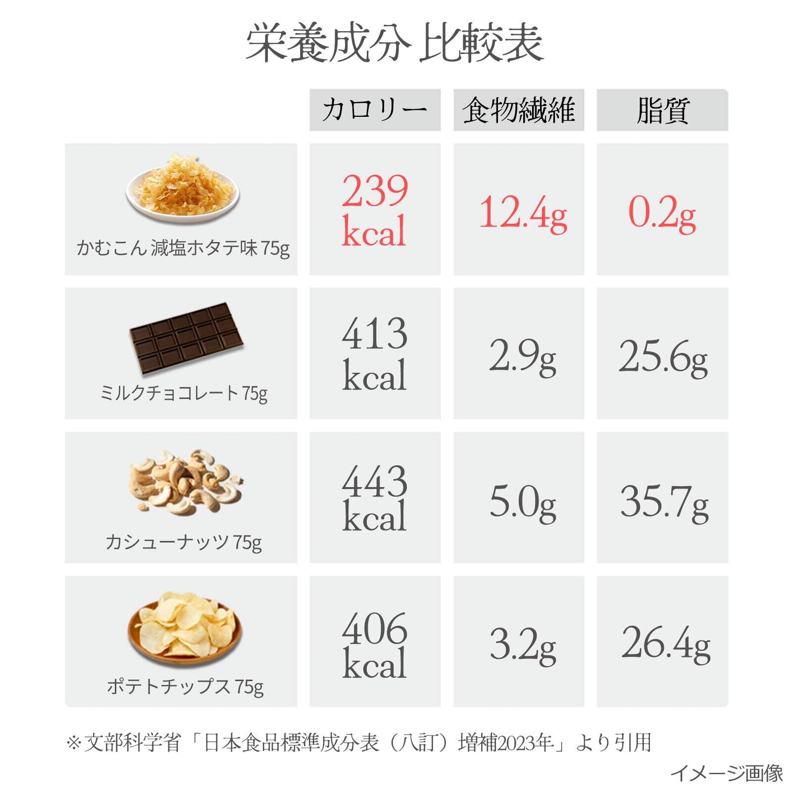 【うれしい食物繊維】「かむこん」は、75gあたり食物繊維がレタス3.5玉分!食物繊維不足の方にも◎(※ホタテ味の場合。レタス1玉当たり300gで算出)